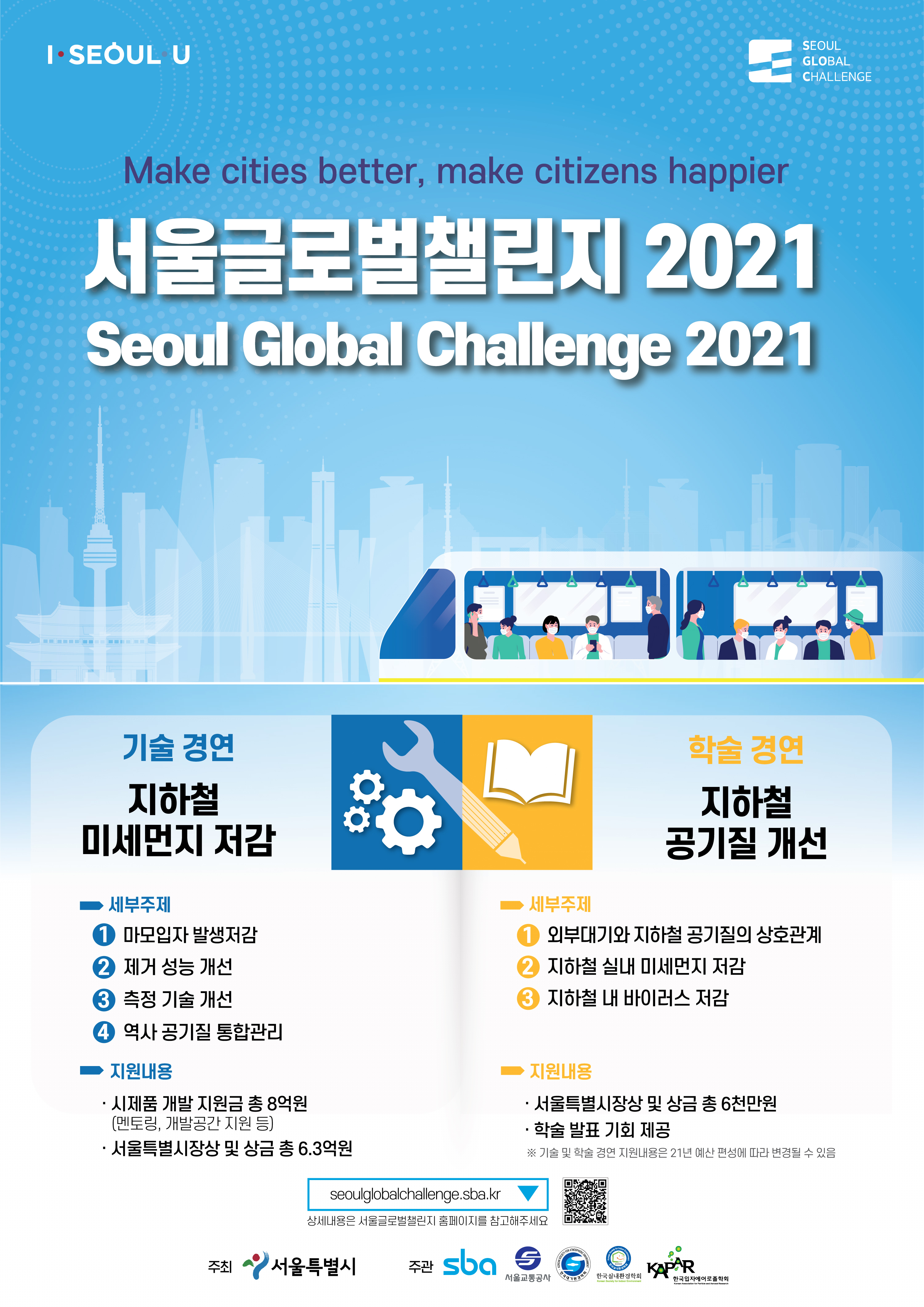 [서울산업진흥원] 서울글로벌챌린지 2021 (주제 : 지하철 미세먼지 저감 및 공기질 개선) 안내 작성자 : 대한환경공학회 작성일 : 2020-10-23 조회수 : 876 「서울글로벌챌린지 2021」 공고문.pdf (다운로드 : 103회) [국문] 서울글로벌챌린지 2021 포스터.jpg (다운로드 : 113회) 목록
