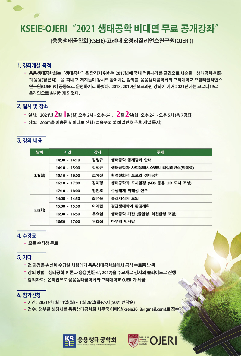 [응용생태공학회] "2021 생태공학 비대면 무료 공개강좌" 안내 작성자 : 대한환경공학회 작성일 : 2021-01-12 조회수 : 846 2021생태공학공개강좌 신청서.hwp (다운로드 : 94회) 2021생태공학공개강좌안내.jpg (다운로드 : 108회) 목록