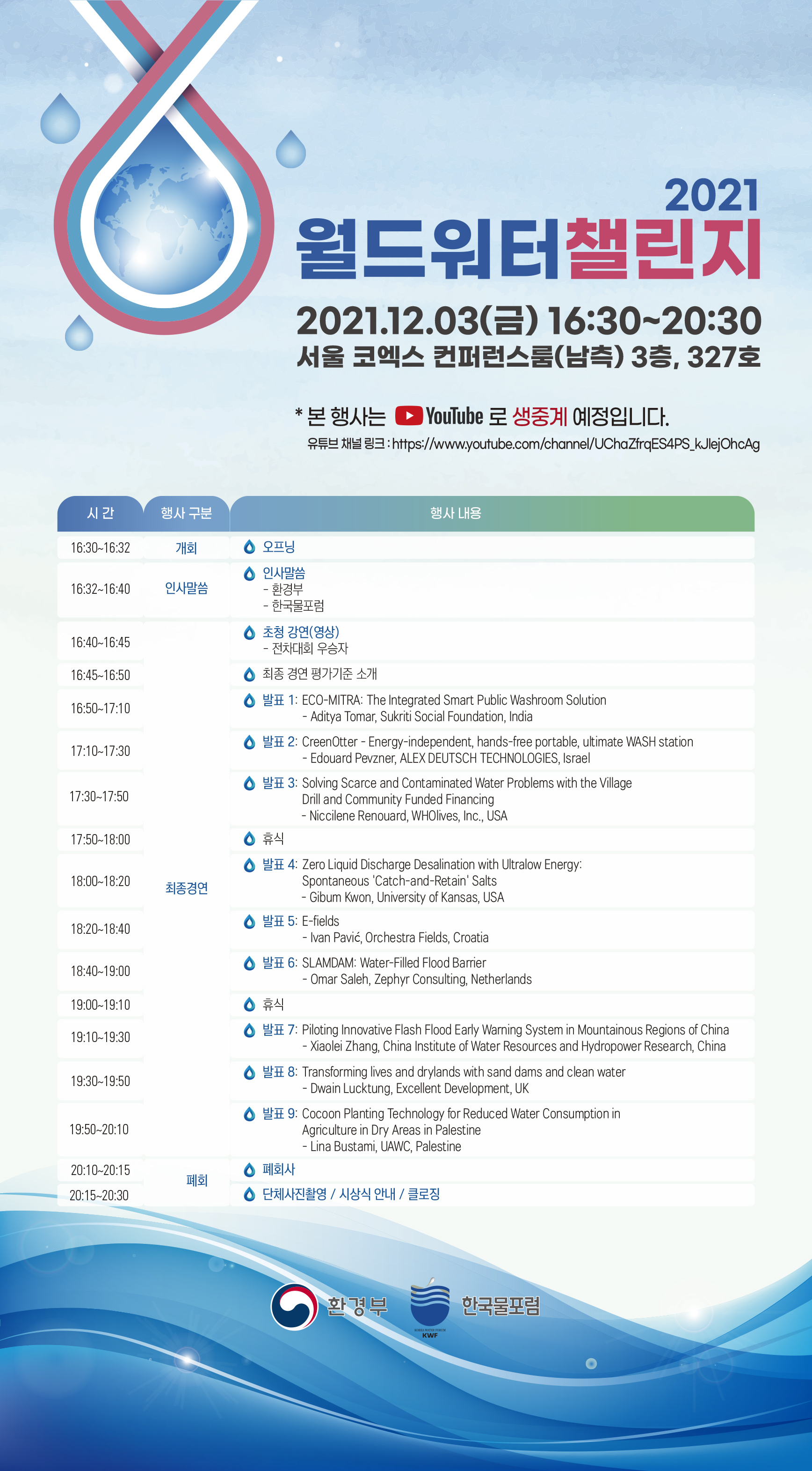 [월드워터챌린지2021] 월드워터챌린지 2021/World Water Challenge 2021 작성자 : 대한환경공학회 작성일 : 2021-11-16 조회수 : 643 http://www.kiww.org/fairContents.do?FAIRMENU_IDX=5814&hl=KOR (첨부 1)211115_월드워터챌린지 2021_최종경연계획.hwp (다운로드 : 100회) (첨부 2)WWCH2021_E-Poster.jpg (다운로드 : 140회) 목록