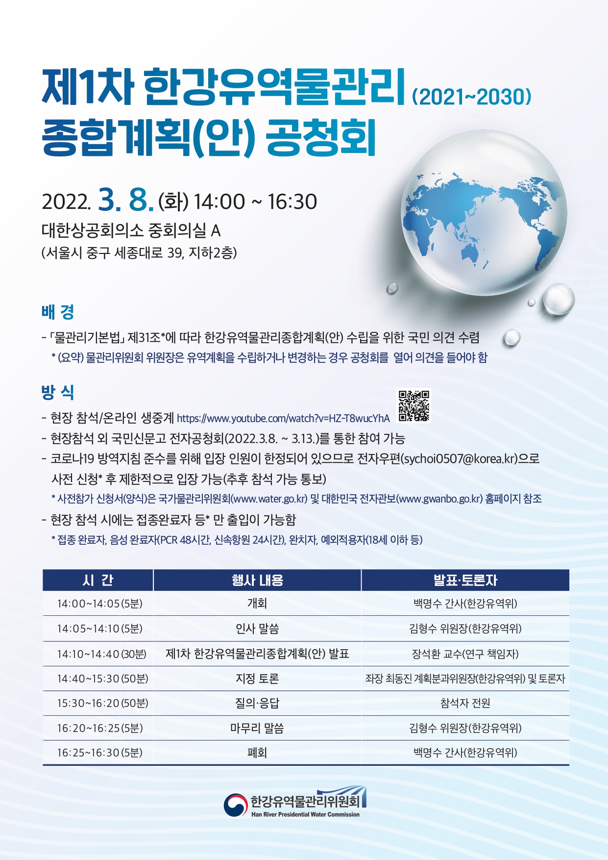 [한강물유역관리위원회] 제1차 한강유역물관리종합계획(안) 공청회 개최 작성자 : 대한환경공학회 작성일 : 2022-03-02 조회수 : 566 (붙임1) 공청회 개최 계획안.hwp (다운로드 : 106회) (붙임2) 사전참가 신청서 양식.hwp (다운로드 : 93회) (붙임3) 한강유역물관리종합계획공청회 포스터.jpg (다운로드 : 122회) 목록
