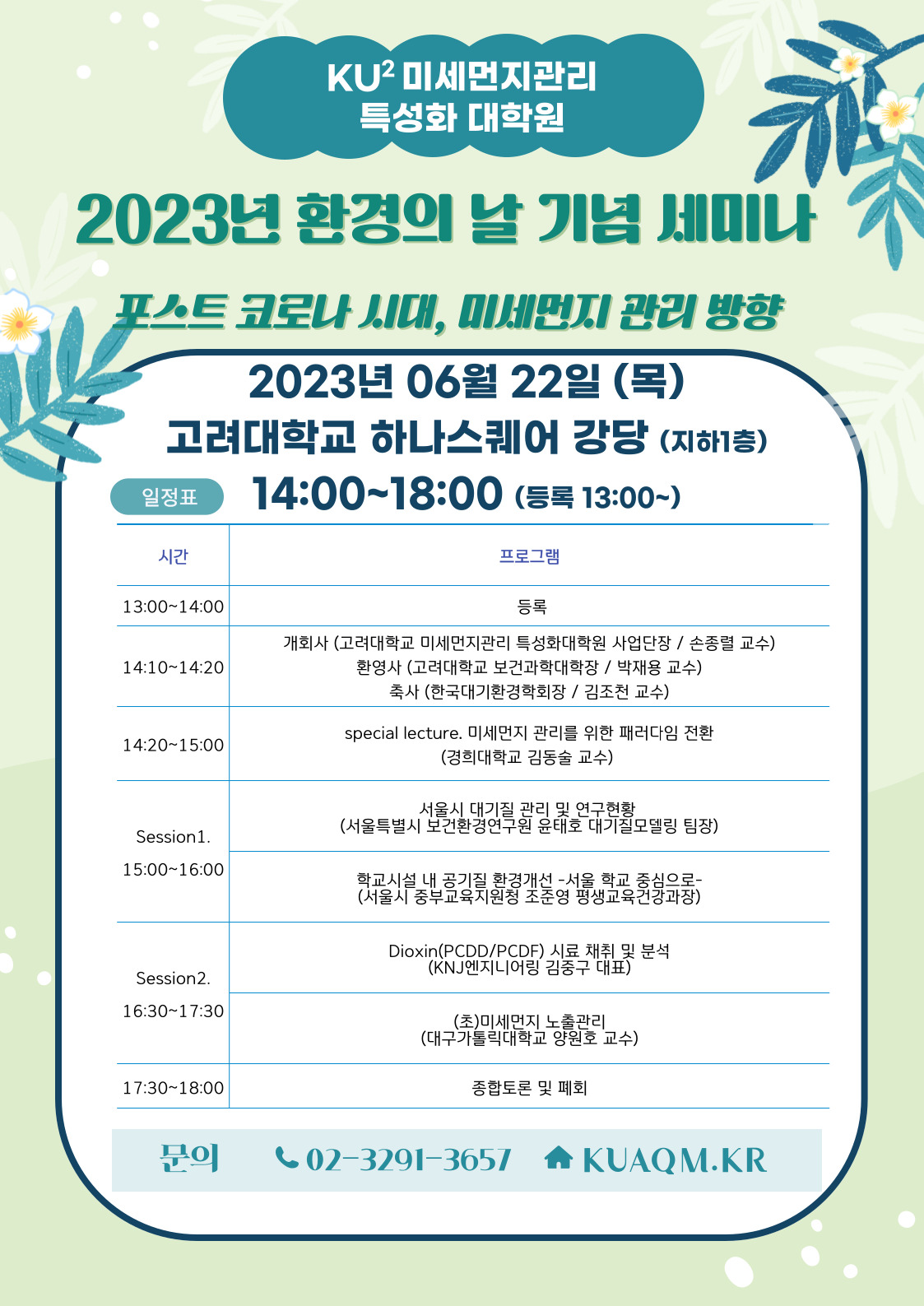 [KU 미세먼지관리 특성화대학원] 2023년 환경의날 기념 특별세미나 개최 안내 작성자 : 대한환경공학회 작성일 : 2023-06-14 조회수 : 426 고려대학교 미세먼지관리 특성화대학원에서 "2023년 환경의날 기념 특별세미나"를 개최합니다. <2023년 환경의날 기념 특별세미나>1. 주제 : 포스트 코로나 시대, 미세먼지 관리 방향2. 일시 : 2023년 06월 22일 (목) 14:00 ~ 18:00 (*등록 13:00~14:00)3. 장소 : 고려대학교 하나스퀘어 강당(자연계캠퍼스, 지하 1층) 2023년 환경의날 기념 특별세미나-포스터(프로그램).jpg (다운로드 : 132회) 목록
