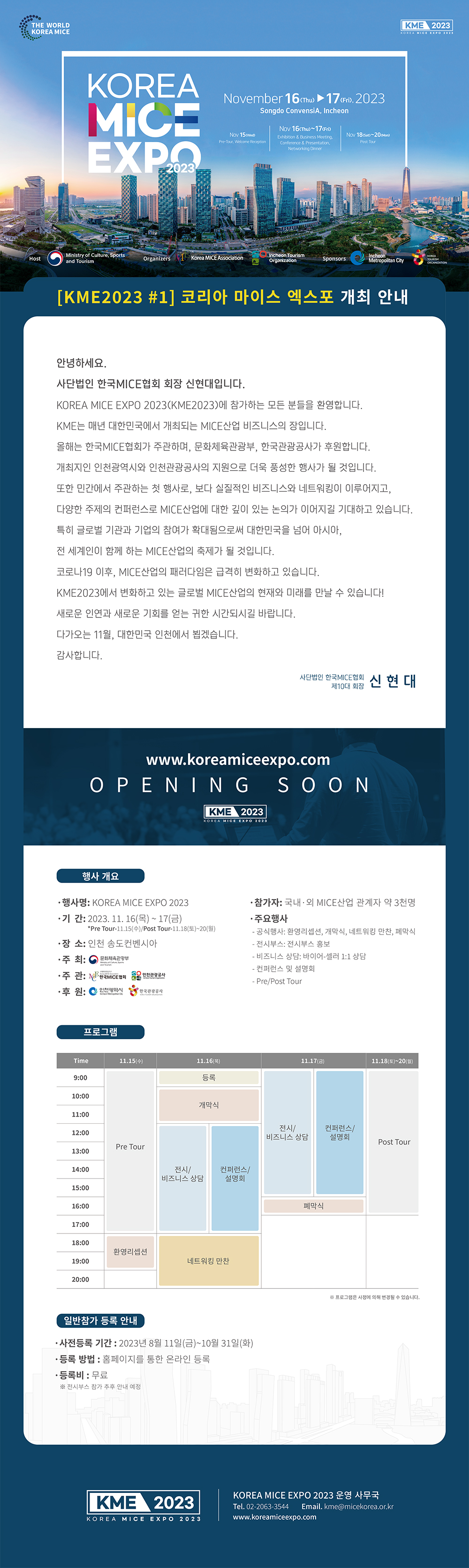 [한국MICE협회] KME2023 #1 코리아 마이스 엑스포 개최 안내(11.16~17, 인천 송도컨벤시아) 작성자 : 대한환경공학회 작성일 : 2023-08-09 조회수 : 494 [KME2023 #1] 코리아 마이스 엑스포 개최 안내(11.16~17, 인천 송도컨벤시아)KOREA MICE EXPO 2023(KME2023)이 다가오는 11월 16일(목)~17일(금),인천 송도컨벤시아에서 개최됩니다.관련하여 아래와 같이 안내드리니 많은 관심과 참여 바랍니다.※ 아래 이미지가 안보이시는 분들은 첨부파일을 확인하여 주시기 바랍니다. KME2023_EDM_1st_0808_1000px.jpg (다운로드 : 138회) 목록