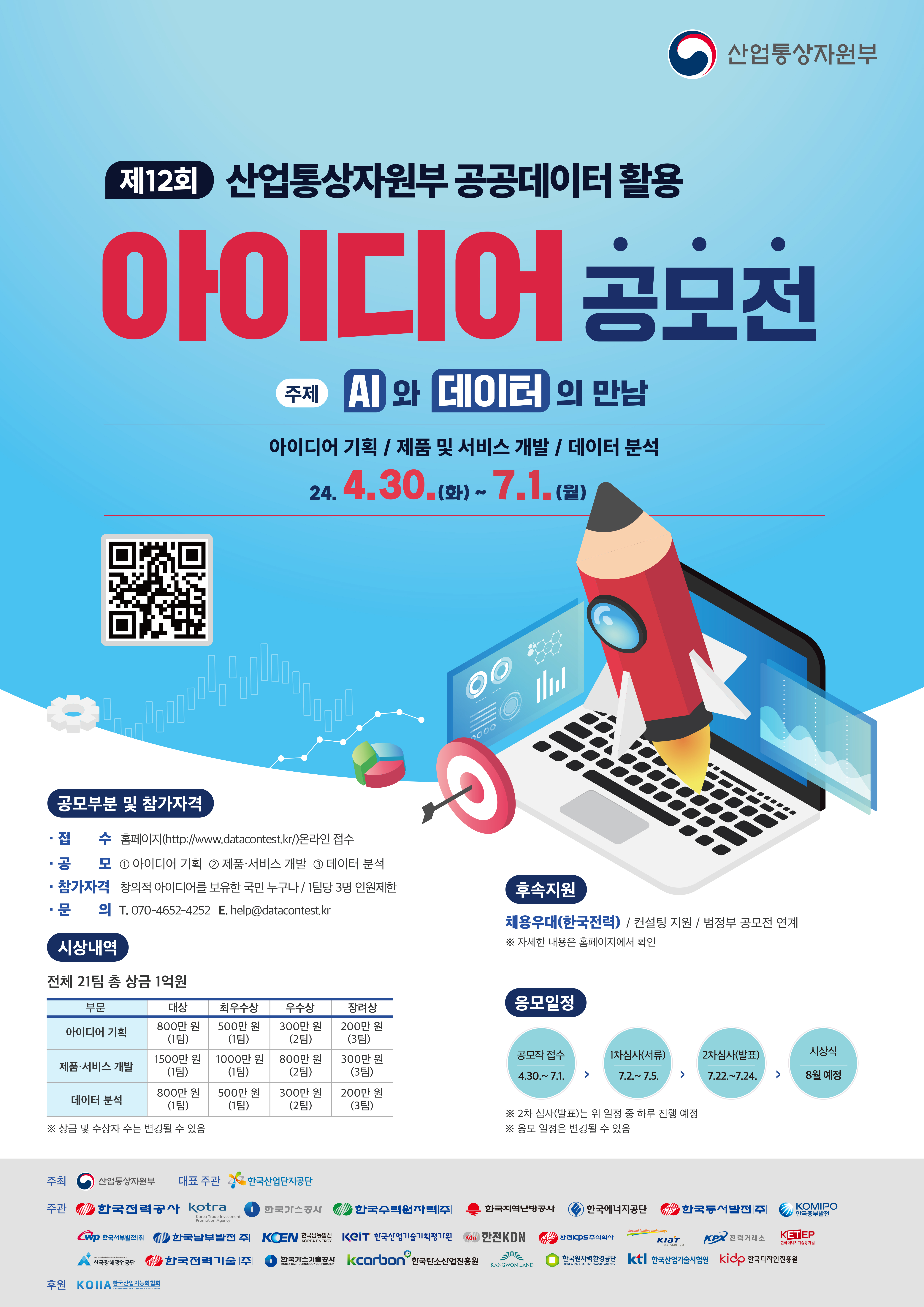 ▶일시 : [아이디어 기획 / 제품 및 서비스 개발 / 데이터 분석부문] 2024. 04. 30 ~ 07. 01▶우수자 시상(상장 및 상금) : 21팀 총 1억▶문의: [산업부 공공데이터 활용 아이디어 공모전 사무국] - 전화 : 070-4652-4252- 팩스 : 070-8288-4100- 메일 : help@datacontest.kr