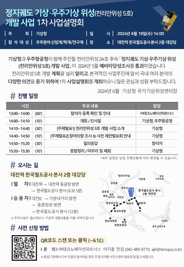 [기상청] '정지궤도 기상·우주기상 위성(천리안위성 5호) 개발 사업' 1차 사업설명회 안내 작성자 : 대한환경공학회 작성일 : 2024-05-31 조회수 : 342 - 사전등록 링크: https://naver.me/GEIakTXB 첨부2. 천리안위성 5호 개발 사업 1차 사업설명회 안내문.pdf (다운로드 : 134회) 첨부1. (공문) 정지궤도 기상·우주기상 위성(천리안위성 5호) 개발 사업 1차 사업설명회 개최 협조 요청.pdf (다운로드 : 137회) 첨부3. 천리안위성 5호 개발 사업 1차 사업설명회 안내문.jpg (다운로드 : 167회) 목록