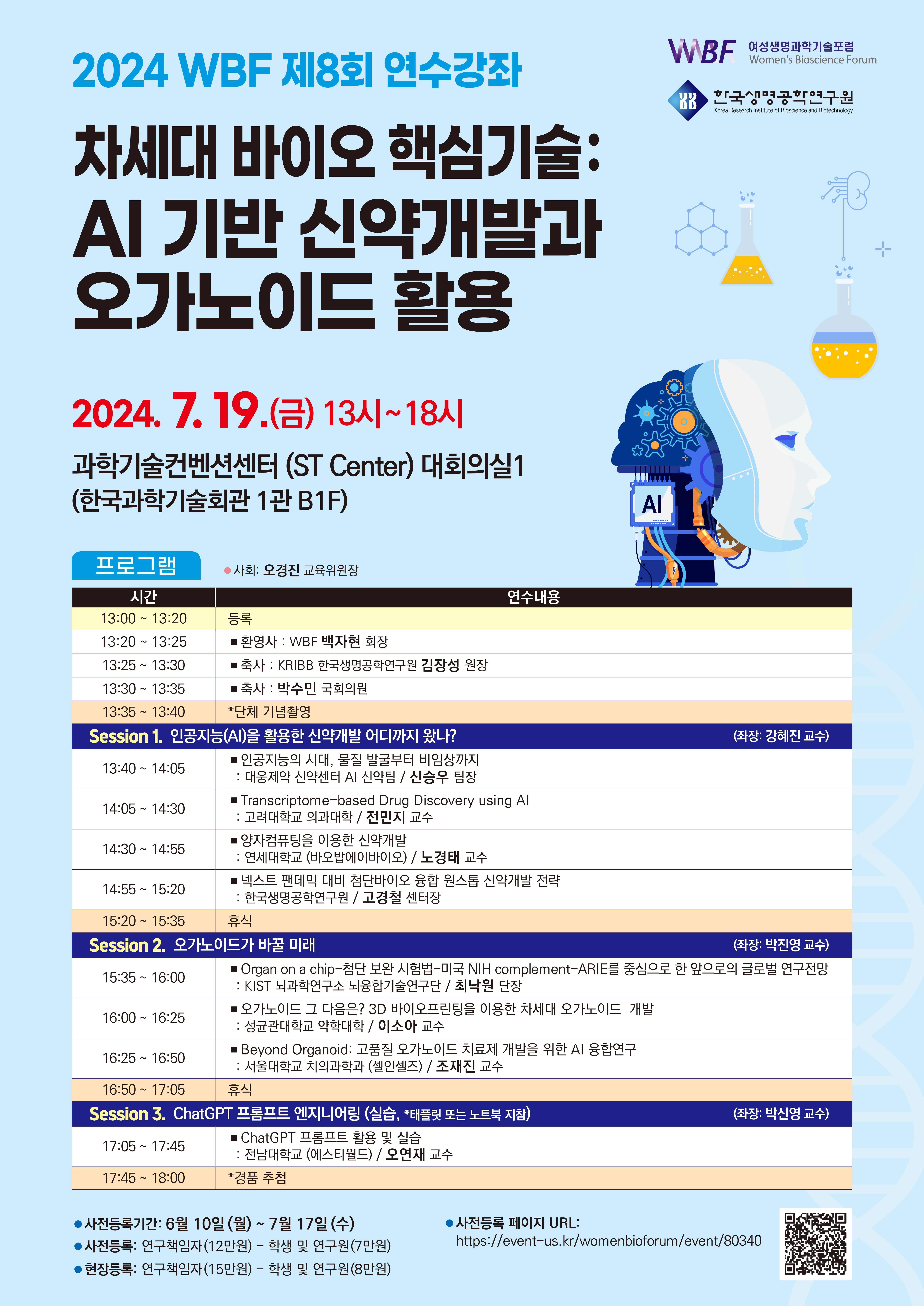 사단법인 여성생명과학기술포럼에서는 매년 최신연구기법과 관련한 연수강좌를 진행하고 있으며, 올해는 '차세대 바이오 핵심기술: AI 기반 신약개발과 오가노이드 활용‘라는 주제에 대한 8개의 강연을 진행합니다.