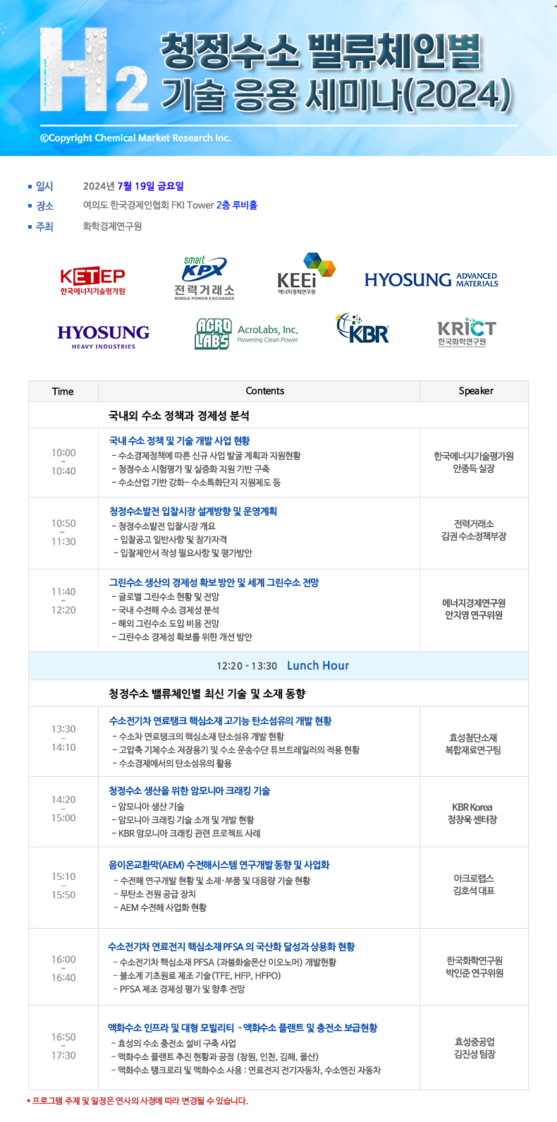 [화학경제연구원] 2024 청정수소 밸류체인별 기술 응용 세미나 개최 안내(7.19 변경) 작성자 : 대한환경공학회 작성일 : 2024-06-19 조회수 : 366 2024 청정수소 밸류체인별 기술 응용 세미나 개최 안내 5. 24년 청정수소 세미나 프로그램(2024) 배너.jpg (다운로드 : 158회) 1.화학경제연구원_청정수소 밸류체인별 기술 응용 세미나(2024)_프로그램 일정.pdf (다운로드 : 211회) 목록