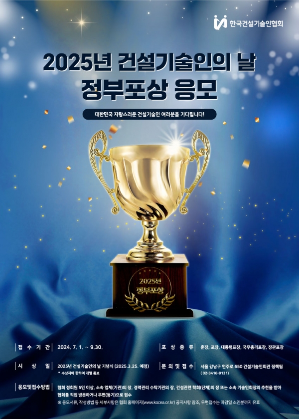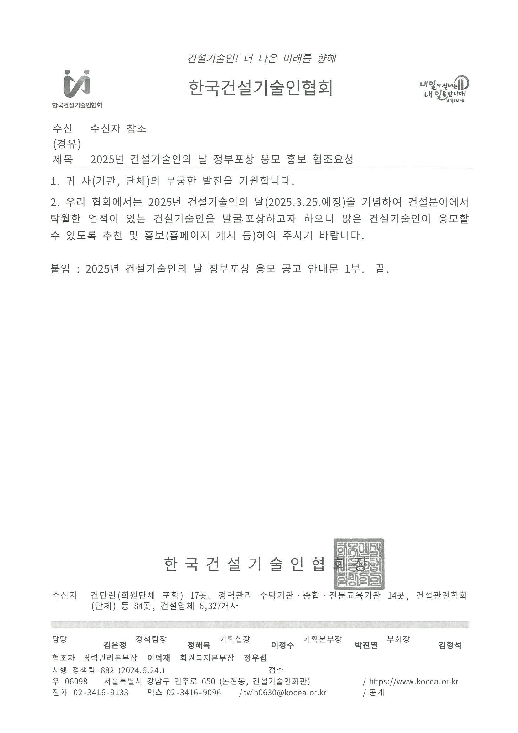 [한국건설기술인협회] 2025년 건설기술인의 날 정부포상 응모 기간 연장 안내(~10.31) 작성자 : 대한환경공학회 작성일 : 2024-07-10 조회수 : 445 한국건설기술인협회 2025년 정부포상 안내 포스터.jpg (다운로드 : 163회) 포상추천기준.hwp (다운로드 : 129회) [한국건설기술인협회] 2025년 건설기술인의 날 정부포상 응모 안내.jpg (다운로드 : 160회) 목록