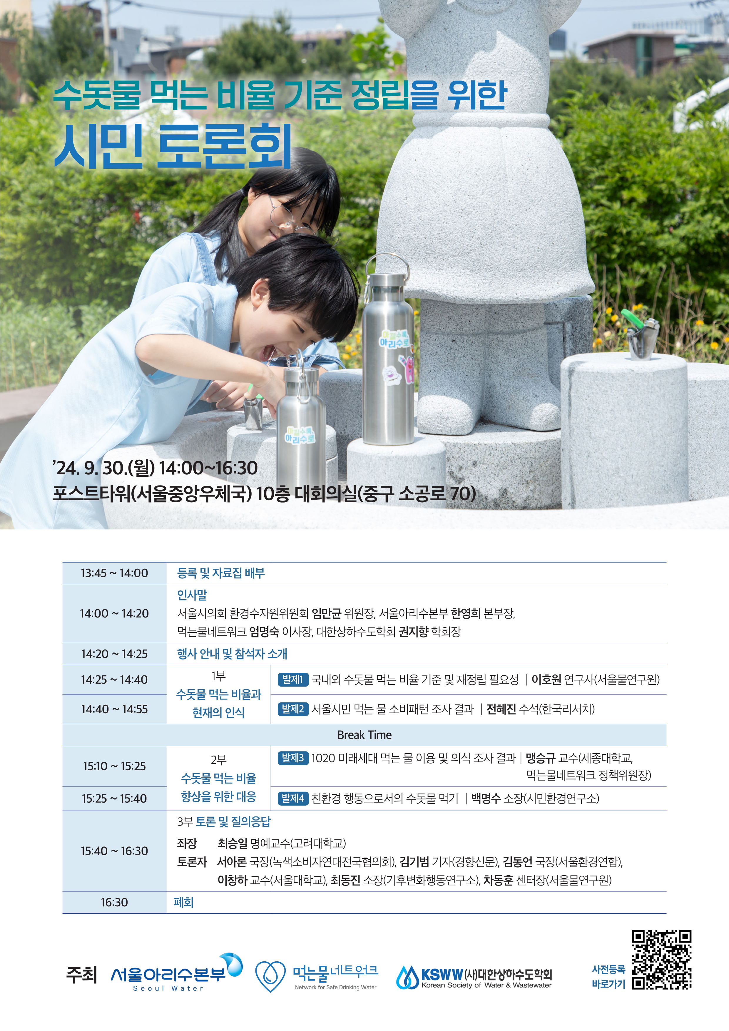 [서울물연구원] 수돗물 먹는 비율 기준 정립을 위한 시민 토론회 개최 안내 작성자 : 대한환경공학회 작성일 : 2024-09-19 조회수 : 412 서울물연구원수돗물 먹는 비율 기준 정립을 위한 시민 토론회 개최 안내 ■ 주제 : 수돗물 먹는 비율 기준 정립을 위한 시민 토론회■ 포럼 일정 : 9.30.(월)14:00 / 포스트타워(명동)■ 사전신청 주소 : https://forms.gle/vnL2rTQvy9epES799 수돗물 먹는 비율 기준 정립을 위한 시민 토론회 웹포스터_png.png (다운로드 : 184회) 목록