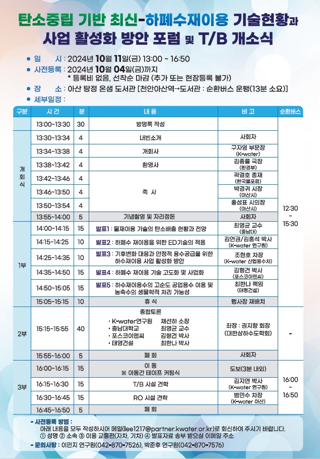 [한국수자원공사] 탄소중립 기반 최신-하폐수재이용 기술현황과 사업 활성화 방안 포럼 및 테스트베드 개소식 추가 안내 작성자 : 대한환경공학회 작성일 : 2024-09-20 조회수 : 503 순환버스 노선도.pdf (다운로드 : 198회) 하폐수재이용 기술현황과 사업 활성화 방안 포럼_안내문.jpg (다운로드 : 174회) 목록