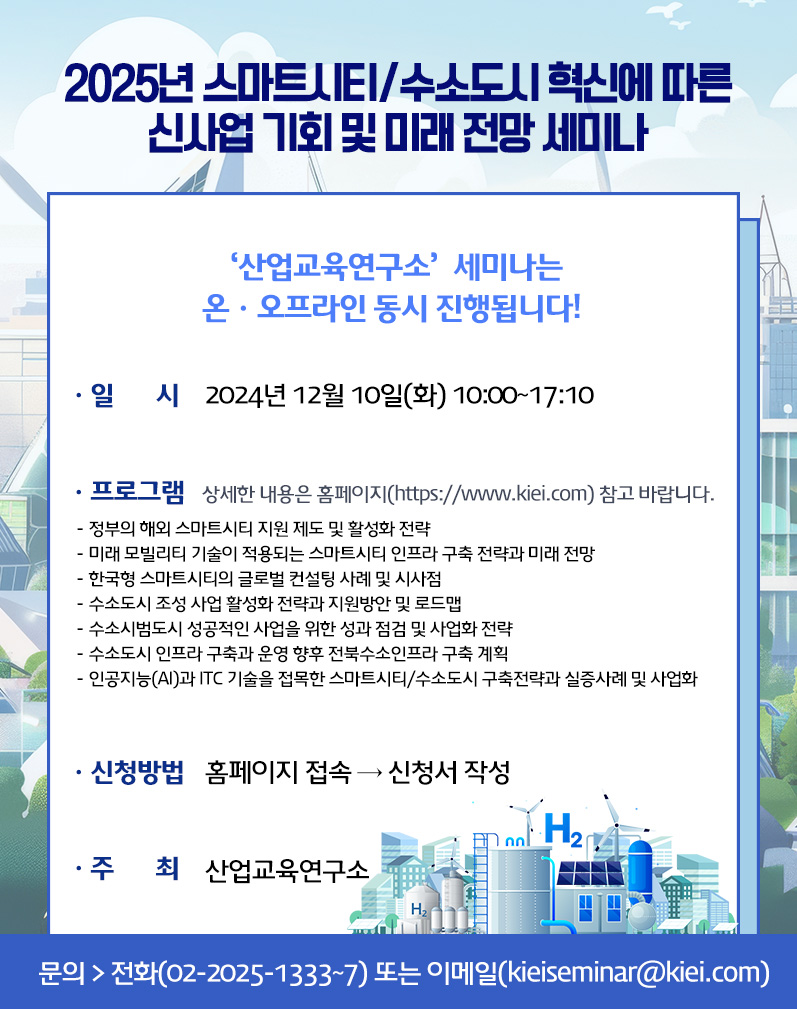 [산업교육연구소] 2025년 스마트시티/수소도시 혁신에 따른 신사업 기회 및 미래 전망 세미나 개최 안내 작성자 : 대한환경공학회 작성일 : 2024-11-20 조회수 : 213 2024.12.10_수소도시_세미나_홍보포스터.jpg (다운로드 : 186회) 목록