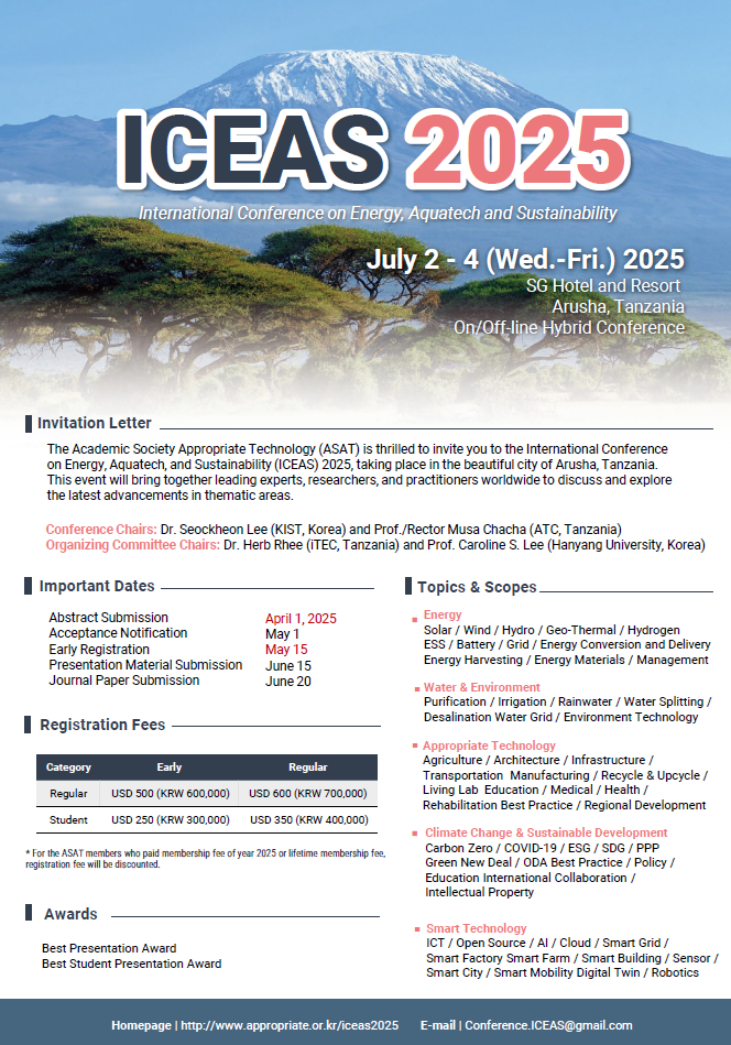[적정기술학회] ICEAS 2025 개최 안내 (7/2~7/4, Arusha, Tanzania) 작성자 : 대한환경공학회 작성일 : 2025-02-18 조회수 : 235 ​http://www.appropriate.or.kr/iceas2025 적정기술학회ICEAS 2025 개최 안내 (7/2~7/4, Arusha, Tanzania) 적정기술학회에서는 오는 7월 2일(수)~4일(금), 탄자니아에서 ICEAS (International Conference on Energy, Aquatech and Sustainability) 2025를 개최합니다. 초록 제출 마감일: 2025년 4월 15일(화)로 연장※ 초록 제출 : https://forms.gle/W4T89TQAJ41m5NQ68 abstract_form_ICEAS 2025.doc (다운로드 : 184회) ICEAS 2025 Poster.png (다운로드 : 208회) 목록