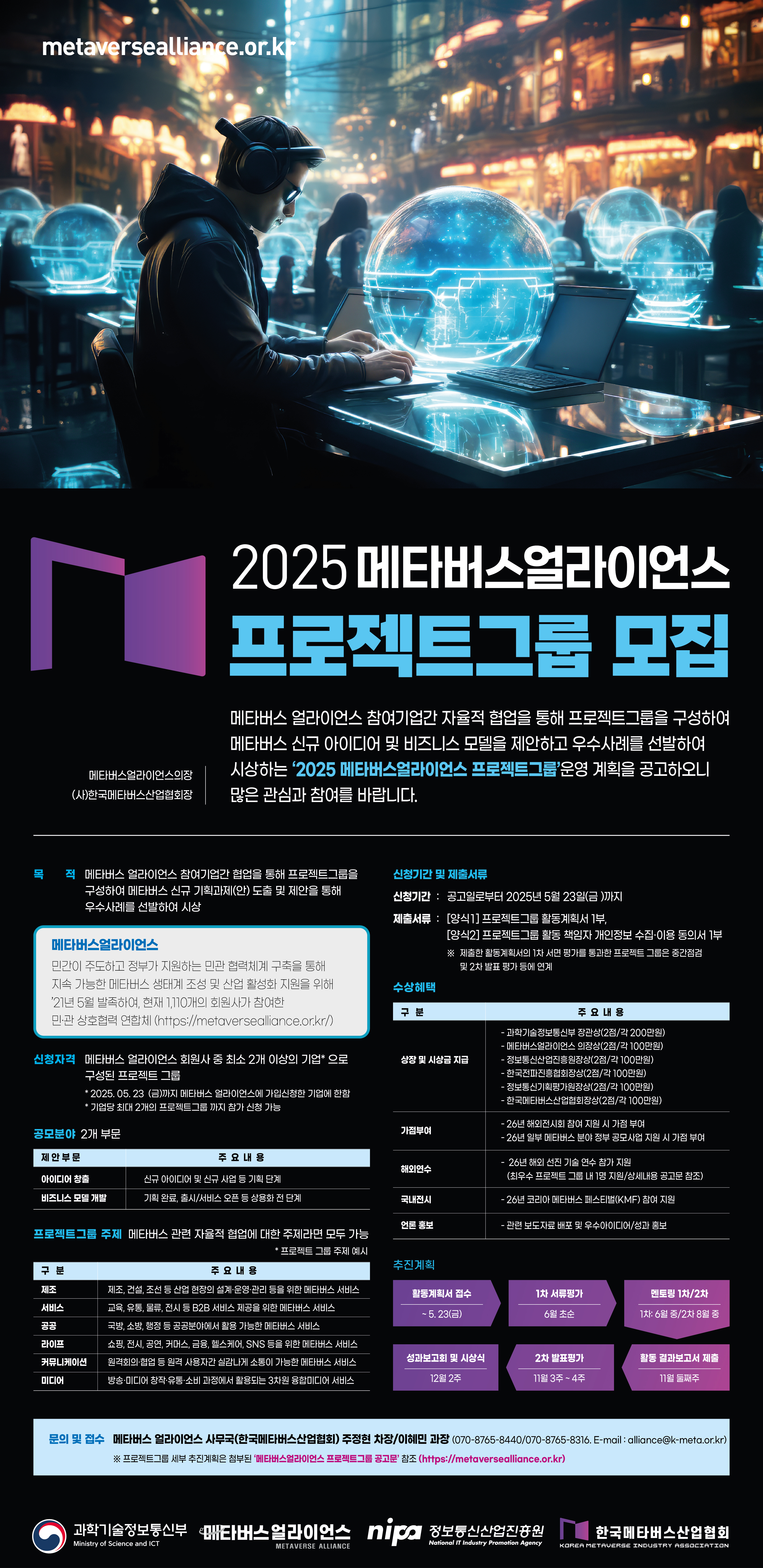 [한국메타버스산업협회]2025년 메타버스 얼라이언스 프로젝트그룹 모집 안내 작성자 : 대한환경공학회 작성일 : 2025-04-18 조회수 : 255 첨부1. 2025 메타버스얼라이언스 프로젝트그룹 모집 공고.hwp (다운로드 : 181회) 첨부2. 2025 메타버스얼라이언스 프로젝트그룹 모집 포스터.jpg (다운로드 : 218회) 목록
