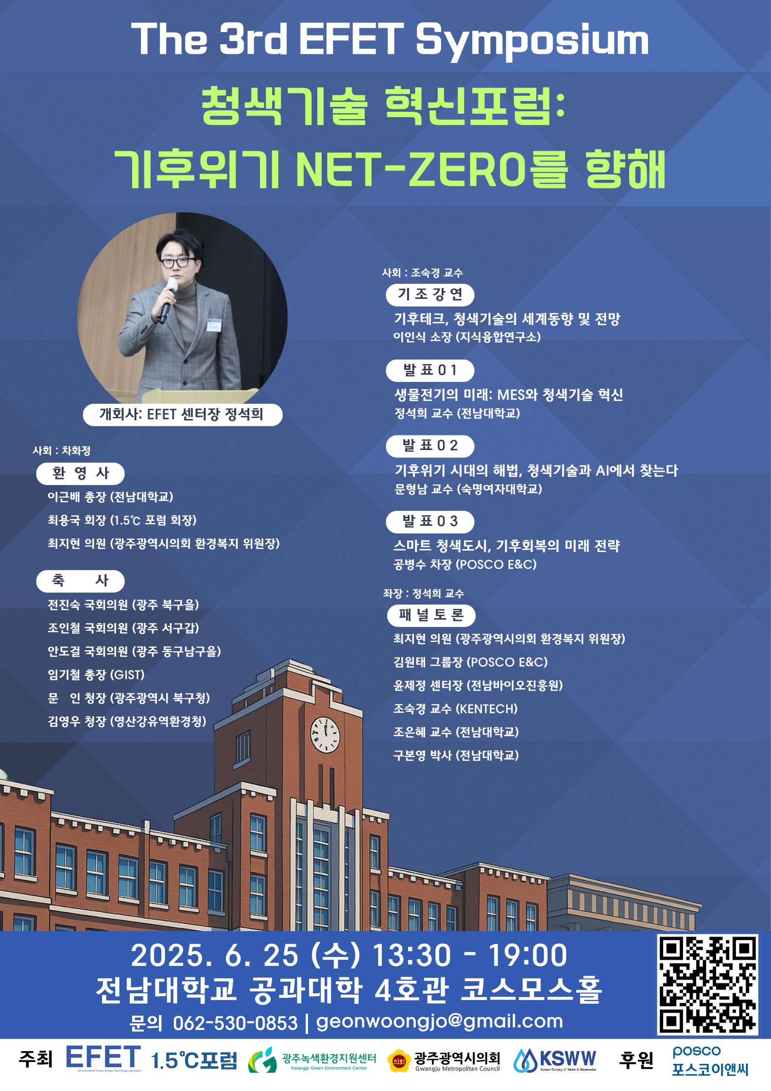 [전남대학교 환경에너지융합센터]제 3회 EFET 심포지엄 청색기술 혁신포럼: 기후위기 NET-ZERO를 향해 안내 작성자 : 대한환경공학회 작성일 : 2025-06-16 조회수 : 241 The 3rd EFET Symposium Blue Technology Innovation Forum: Toward Net-Zero in the Climate Crisis 제 3회 EFET 심포지엄 청색기술 혁신포럼: 기후위기 NET-ZERO를 향해 ○ 일 시 : 2025. 6. 25.(수) 13:30-19:00 ○ 장 소 : 전남대 코스모스홀 (4호관) ○ 주 최 : 전남대 환경에너지융합센터(EFET), 1.5℃ 포럼, 광주녹색환경지원센터(GJGEC), 광주광역시의회 2025 06 14 제3회 EFET 심포지엄 포스터.png (다운로드 : 191회) 제3회 EFET 심포지움 포스터 홍보용.png (다운로드 : 188회) 목록