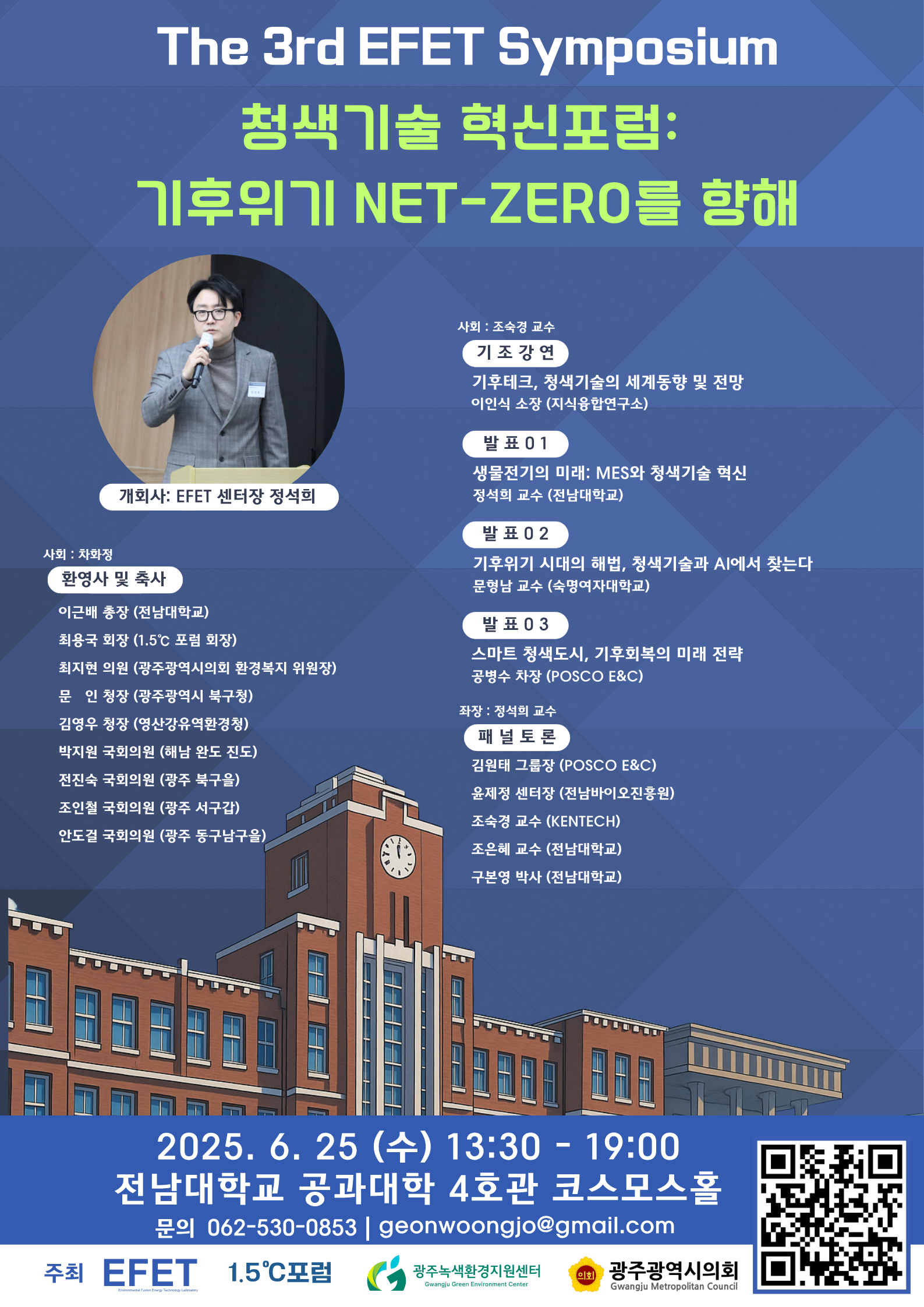 [전남대학교 환경에너지융합센터]제 3회 EFET 심포지엄 청색기술 혁신포럼: 기후위기 NET-ZERO를 향해 안내 작성자 : 대한환경공학회 작성일 : 2025-06-16 조회수 : 202 The 3rd EFET Symposium Blue Technology Innovation Forum: Toward Net-Zero in the Climate Crisis 제 3회 EFET 심포지엄 청색기술 혁신포럼: 기후위기 NET-ZERO를 향해 ○ 일 시 : 2025. 6. 25.(수) 13:30-19:00 ○ 장 소 : 전남대 코스모스홀 (4호관) ○ 주 최 : 전남대 환경에너지융합센터(EFET), 1.5℃ 포럼, 광주녹색환경지원센터(GJGEC), 광주광역시의회 2025 06 14 제3회 EFET 심포지엄 포스터.png (다운로드 : 142회) 제3회 EFET 심포지움 포스터 홍보용.png (다운로드 : 137회) 목록