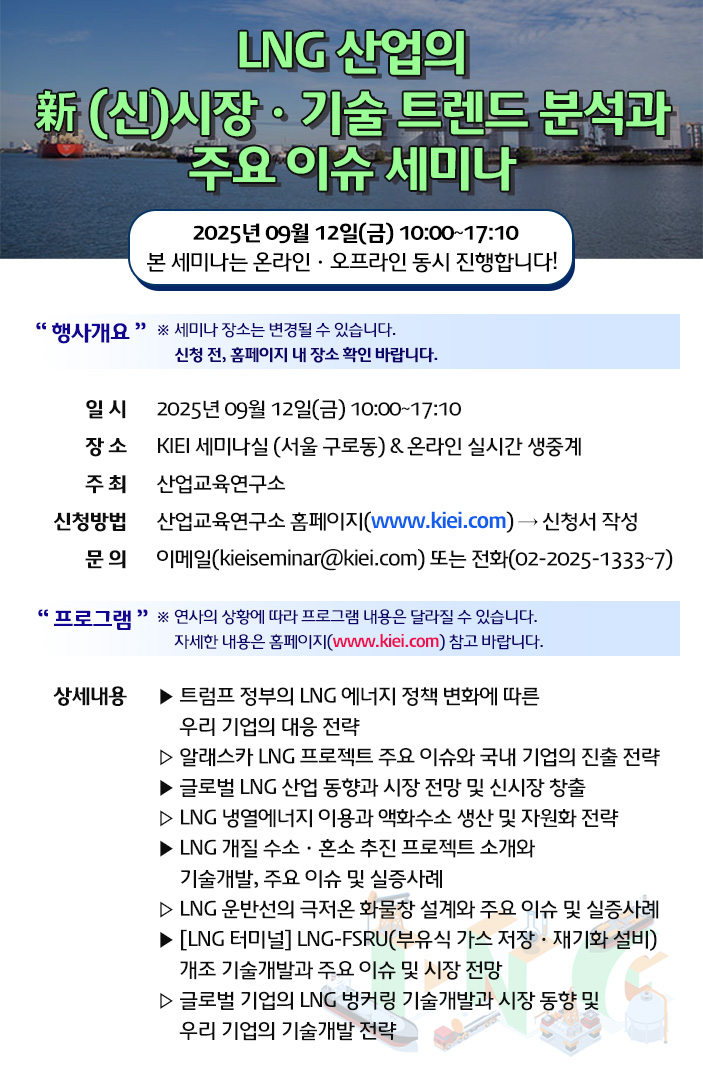 [산업교육연구소] LNG 산업의 신시장ㆍ기술 트렌드 분석과 주요 이슈 세미나 개최 안내 작성자 : 대한환경공학회 작성일 : 2025-08-26 조회수 : 268 산업교육연구소 LNG 산업의 신시장ㆍ기술 트렌드 분석과 주요 이슈 세미나 개최 안내 20250912 세미나안내문.pdf (다운로드 : 161회) 20250912 포스터.jpg (다운로드 : 198회) 목록