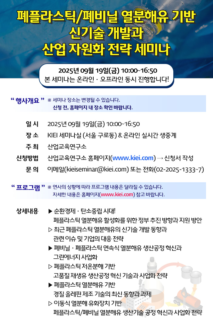 [산업교육연구소] 폐플라스틱/폐비닐 열분해유 기반 신기술 개발과 산업 자원화 전략 세미나 개최 안내 작성자 : 대한환경공학회 작성일 : 2025-09-01 조회수 : 275 산업교육연구소 폐플라스틱/폐비닐 열분해유 기반 신기술 개발과 산업 자원화 전략 세미나 개최 안내 20250919 세미나포스터.jpg (다운로드 : 177회) 20250919 세미나안내문.pdf (다운로드 : 162회) 목록