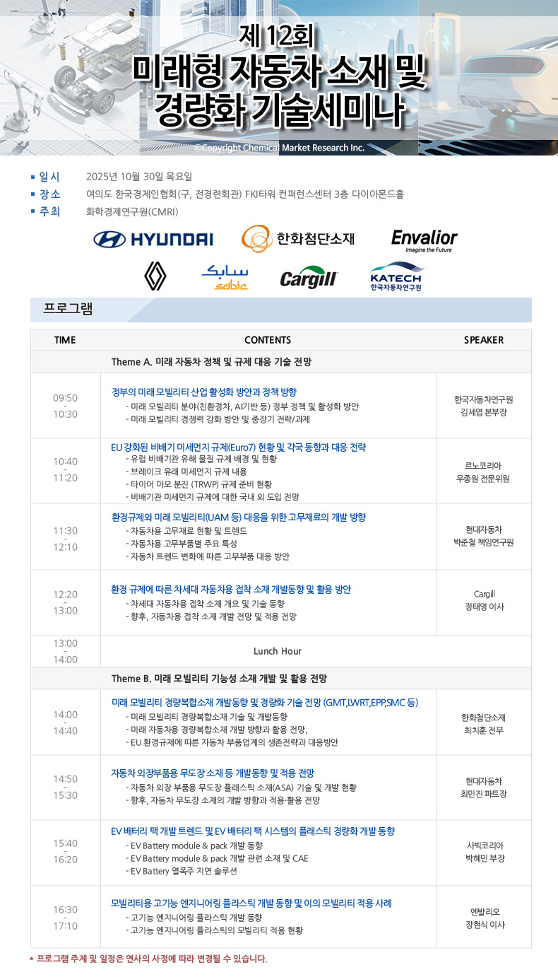 화학경제연구원에서는 제12회 미래형 자동차 소재 및 경량화 기술세미나를 10월 30일(목)에 개최합니다.