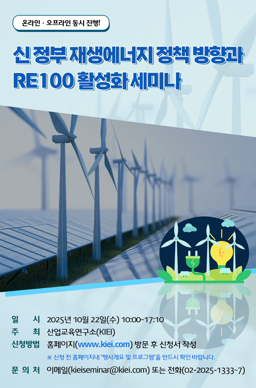 [산업교육연구소] 신 정부 재생에너지 정책 방향과 RE100 활성화 세미나 개최 안내 작성자 : 대한환경공학회 작성일 : 2025-09-25 조회수 : 191 산업교육연구소 신 정부 재생에너지 정책 방향과 RE100 활성화 세미나 개최 안내 20251022RE100 세미나 포스터.jpg (다운로드 : 184회) 20251022RE100 세미나 안내문.pdf (다운로드 : 166회) 목록