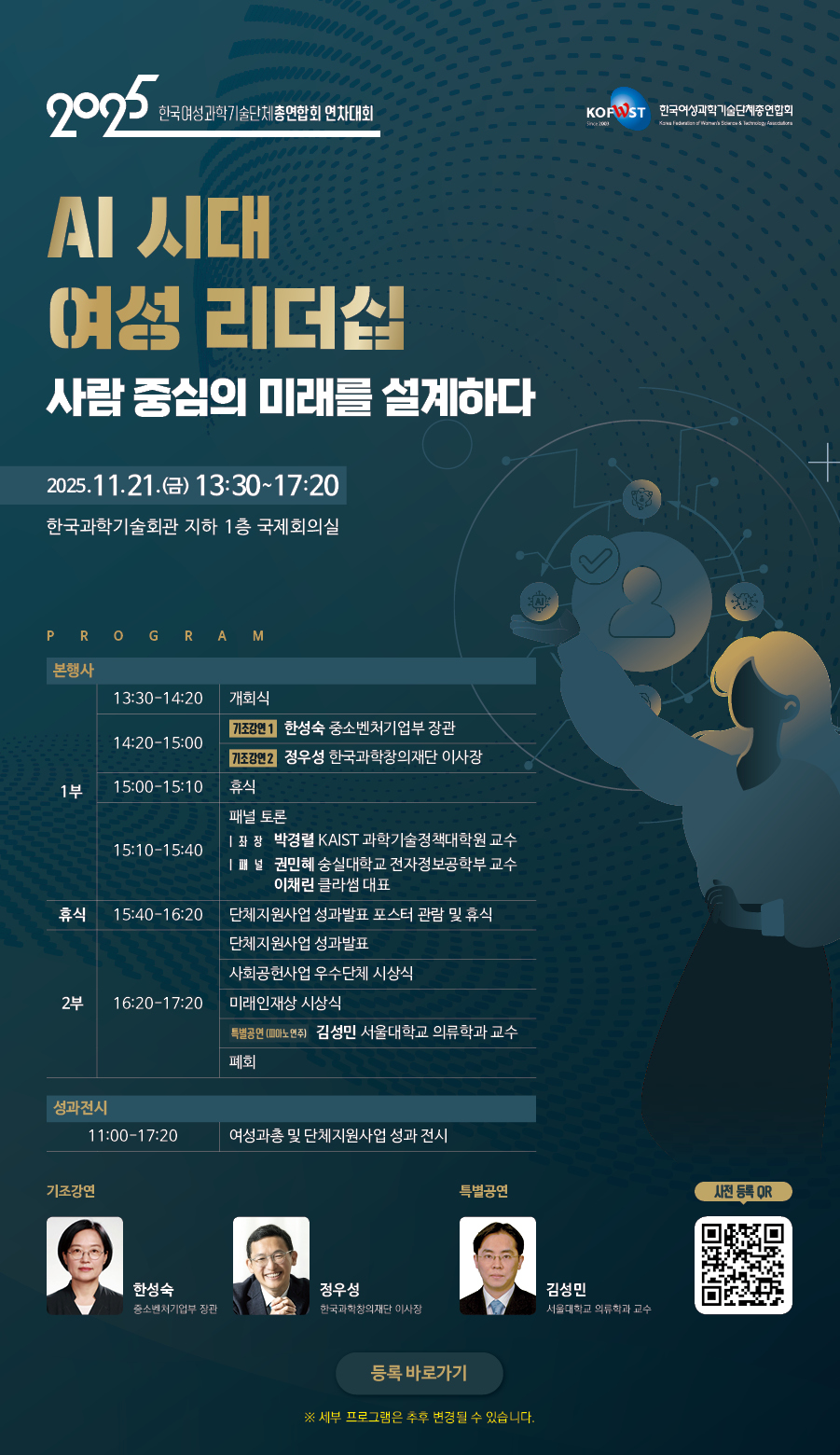[여성과총] 한국여성과학기술단체총연합회 2025 연차대회 개최 안내 작성자 : 대한환경공학회 작성일 : 2025-10-17 조회수 : 43 • 사전등록하기: https://forms.gle/46qs1DNqMXqJiFm39 목록
