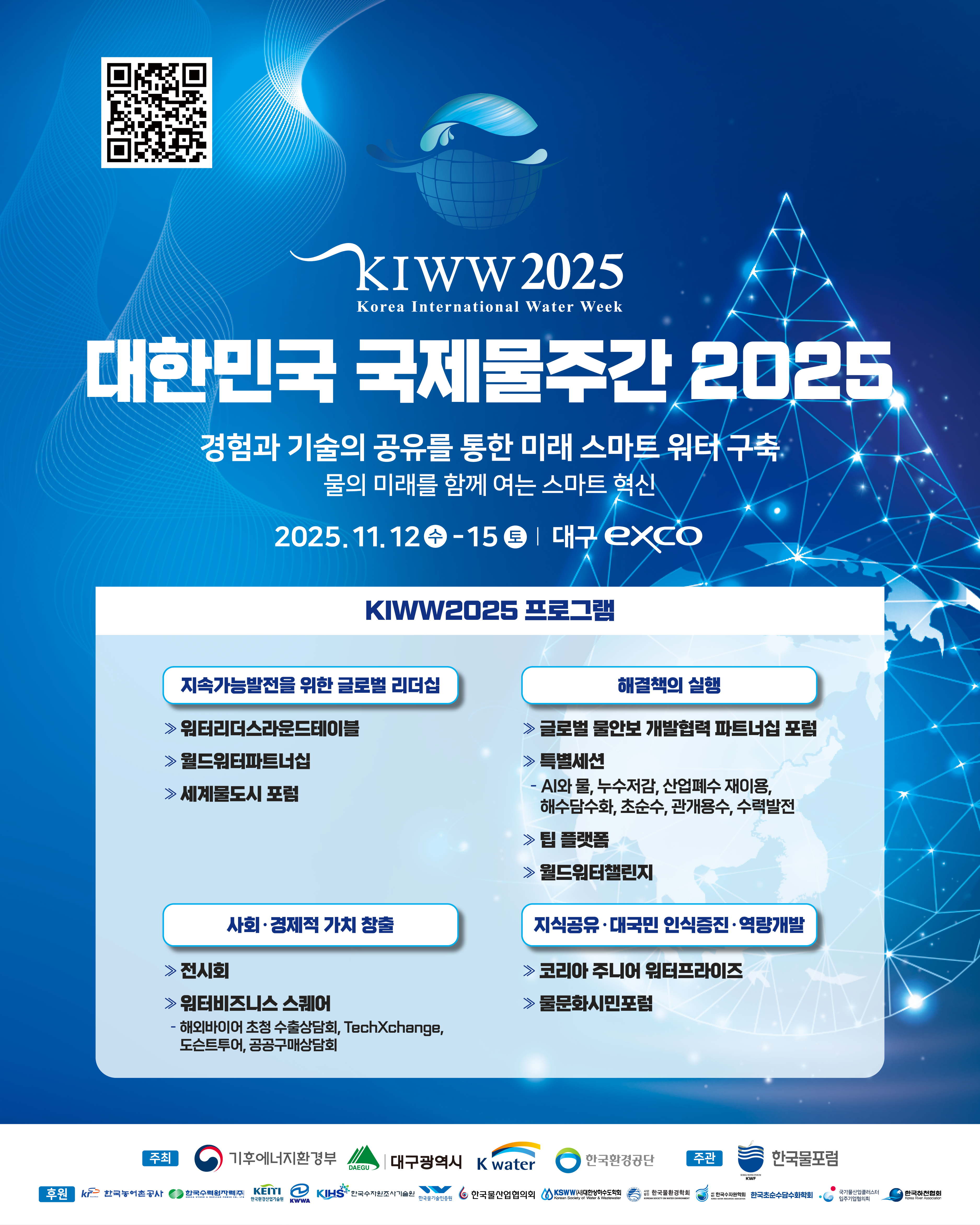 [한국물포럼] '대한민국 국제물주간(KIWW) 2025' 행사 개최 안내 작성자 : 대한환경공학회 작성일 : 2025-11-04 조회수 : 108 붙임1. KIWW2025 포스터.jpg (다운로드 : 91회) 붙임2. KIWW2025 주요프로그램.jpg (다운로드 : 88회) 목록