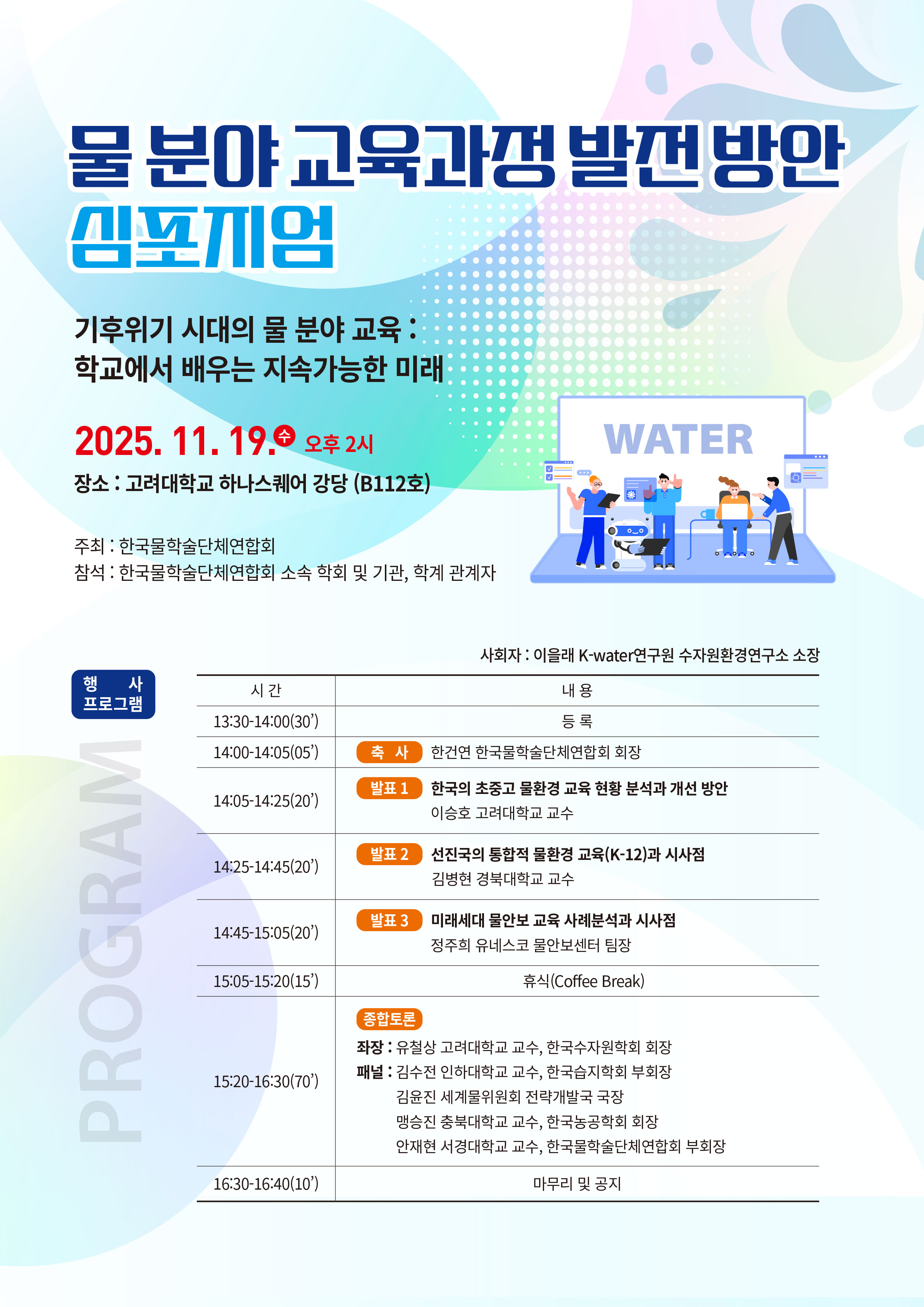 [한국물학술단체연합회] 물분야 교육과정 발전방안 심포지엄 개최 안내 작성자 : 대한환경공학회 작성일 : 2025-11-06 조회수 : 110 물분야 교육과정 발전방안 심포지엄 11.19 .jpeg (다운로드 : 90회) 목록