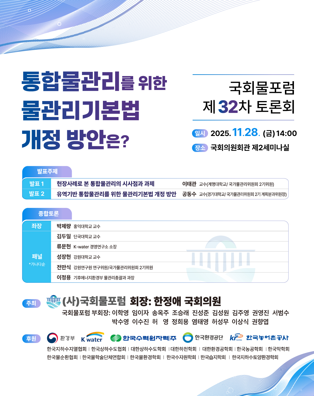 [국회물포럼] 국회물포럼 제32차 토론회 개최 안내 작성자 : 대한환경공학회 작성일 : 2025-11-14 조회수 : 119 붙임2.국회물포럼 제32차 토론회 포스터.jpg (다운로드 : 117회) 붙임1.국회물포럼 제32차 토론회 계획안.pdf (다운로드 : 94회) 목록