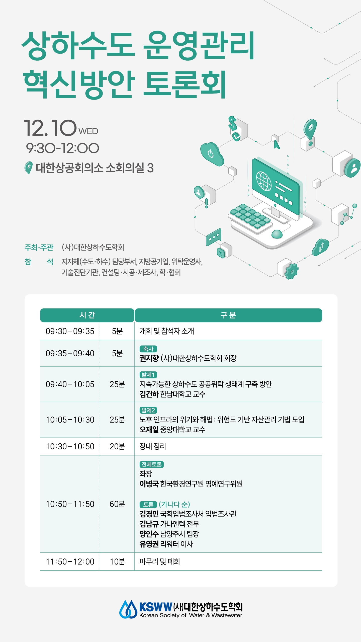 [대한상하수도학회] "상하수도 운영관리 혁신방안 토론회" 개최 안내 작성자 : 대한환경공학회 작성일 : 2025-12-01 조회수 : 96 ○ 행사명 : 상하수도 운영관리 혁신방안 토론회 ○ 일시 : 2025년 12월 10일(수) 오전 9:30-12:00 ○ 장소 : 대한상공회의소 소회의실 3 ○ 주관 : (사)대한상하수도학회 ○ 참석 : 지자체(수도·하수) 담당부서, 지방공기업, 위탁운영사, 기술진단기관, 컨설팅·시공·제조사, 학·협회 사전등록 바로가기 대한상하수도학회 2025 운영관리 토론회 포스터 251201.pdf (다운로드 : 83회) 대한상하수도학회 2025 운영관리 토론회 포스터이미지 251201.jpg (다운로드 : 86회) 목록