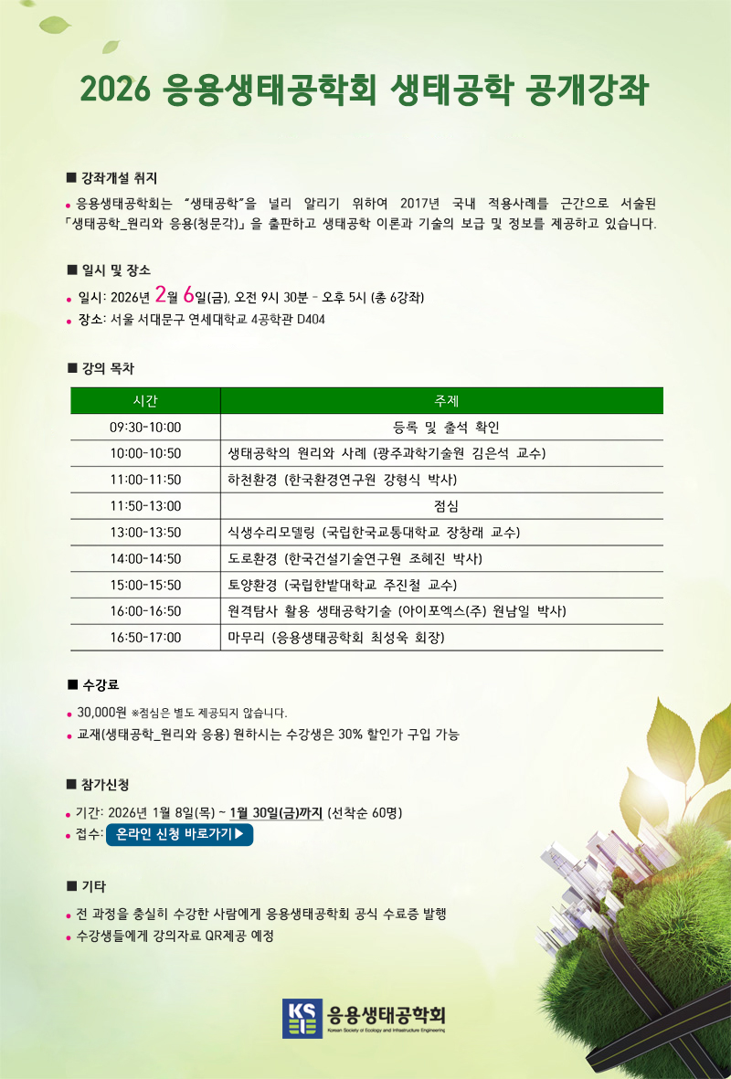 [응용생태공학회] 2026 응용생태공학회 생태공학 공개강좌 신청 안내 작성자 : 대한환경공학회 작성일 : 2026-01-09 조회수 : 81 https://docs.google.com/forms/d/e/1FAIpQLSfSzV81wW4jo0NabW7XfGVEgJKVrJMABpd8Mg9G7Zru2EdEMA/viewform 2026응용생태공학회생태공학공개강좌.jpg (다운로드 : 67회) 목록