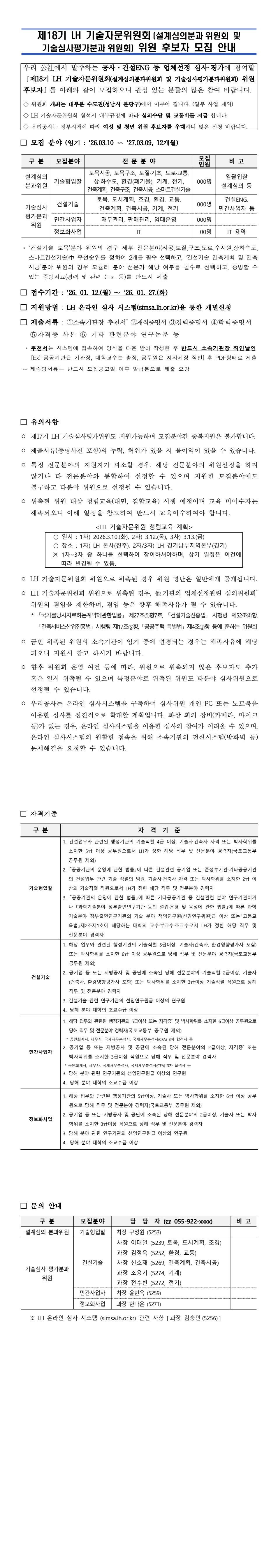 [한국토지주택공사] 제18기 LH 기술자문위원회 위원 후보자 모집 안내 작성자 : 대한환경공학회 작성일 : 2026-01-13 조회수 : 24 제18기 LH 기술자문위원회 위원 후모자 모집 안내 협회 .pdf (다운로드 : 4회) 목록