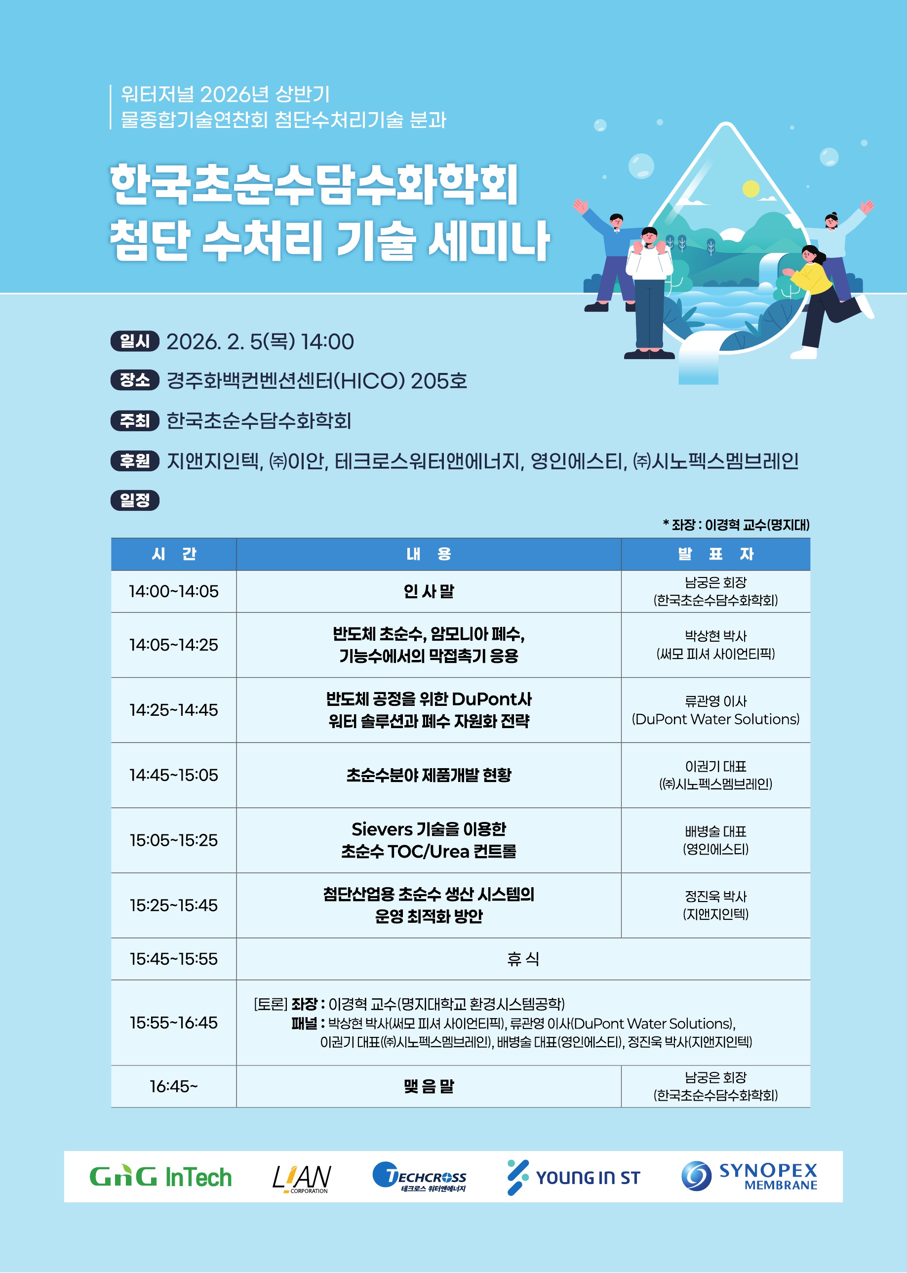 [한국초순수담수화학회] 첨단수처리기술 세미나 개최 안내 작성자 : 대한환경공학회 작성일 : 2026-02-03 조회수 : 26 한국초순수담수화학회 첨단수처리기술세미나 안내.pdf (다운로드 : 8회) 물종합기술연찬회 초청장.pdf (다운로드 : 9회) 목록