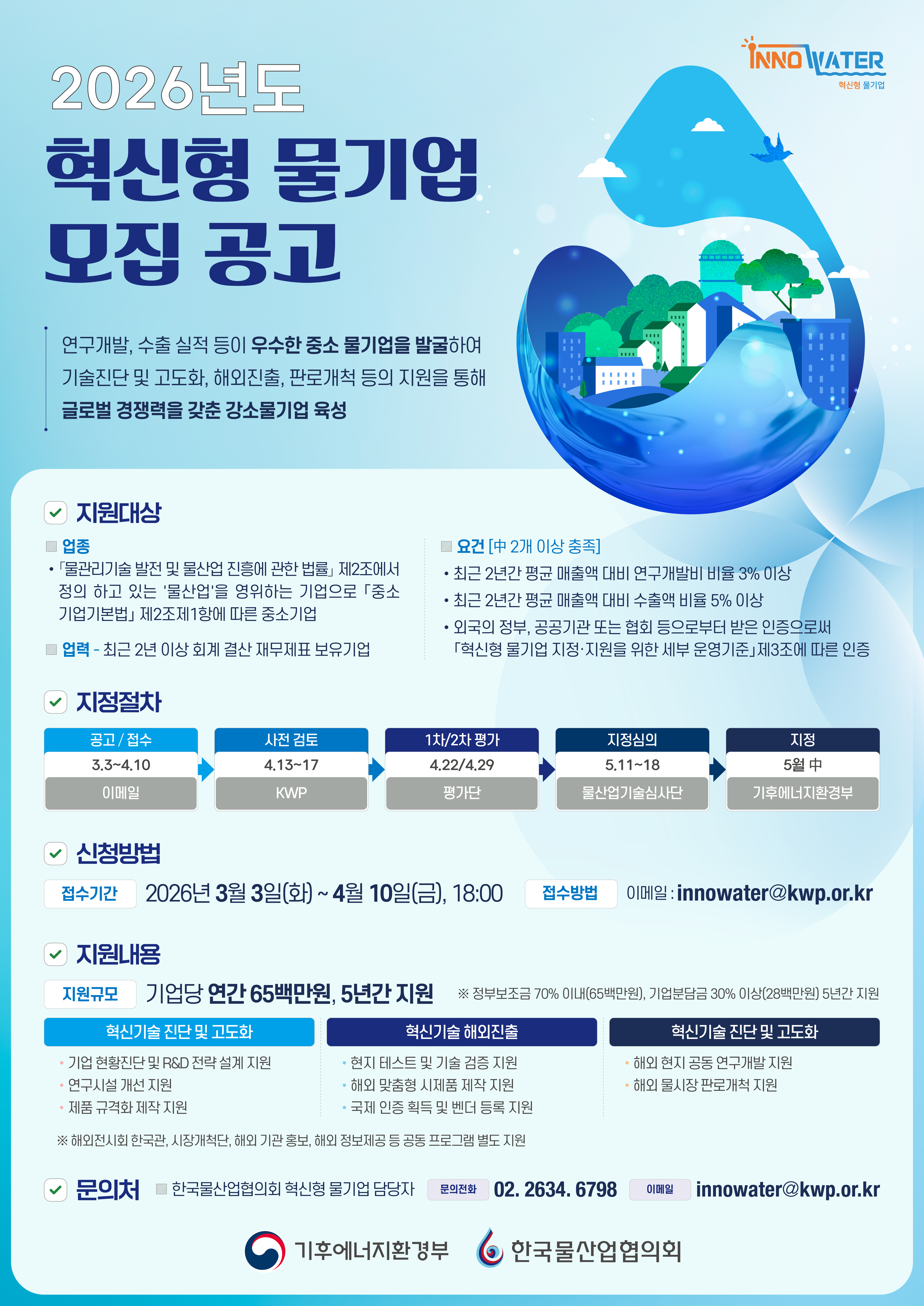 [기후에너지환경부] 2026년도 혁신형 물기업 모집 공고 안내 작성자 : 대한환경공학회 작성일 : 2026-03-05 조회수 : 2 기후부 공고문 2026년 혁신형 물기업 지원 대상 모집 공고.pdf (다운로드 : 0회) 혁신형 물기업 모집 공고 포스터 최종.jpg (다운로드 : 0회) 목록
