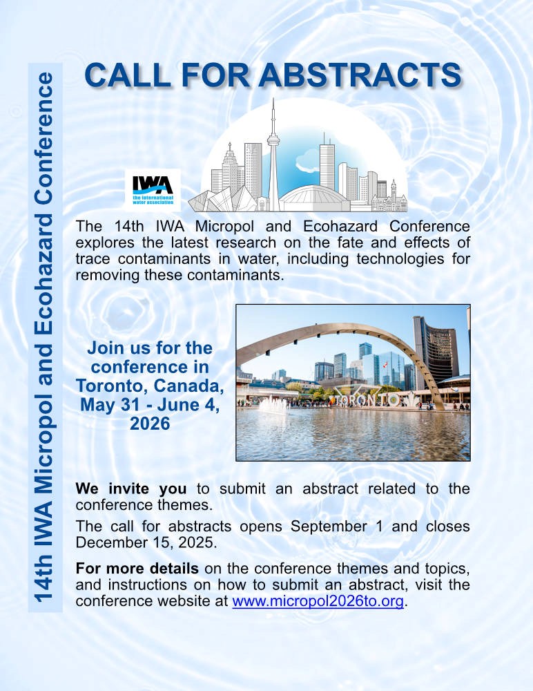 국외 [대한환경공학회 미량오염물질 전문가 그룹] 14th IWA Micropol & Ecohazard Conference 일자 : 05.31 (일) ~ 06.04 (목) 장소 : Toronto, Ontario, Canada Homepage : https://www.micropol2026to.org/ 목록