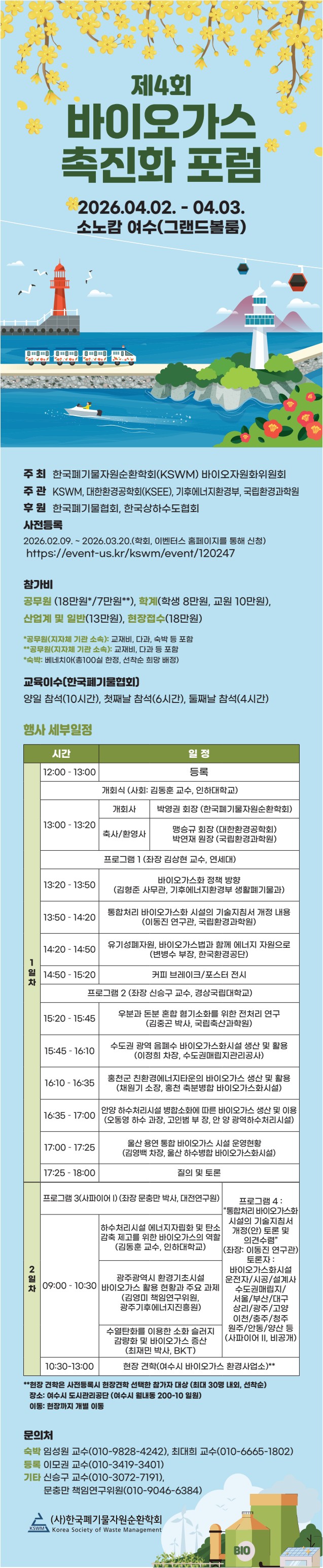 국내 [한국폐기물자원순환학회·대한환경공학회] 제4회 바이오가스 촉진화 포럼 개최 안내 일자 : 04.02 (목) ~ 04.03 (금) 장소 : 소노캄 여수(그랜드볼룸) Homepage : https://event-us.kr/kswm/event/120247 첨부파일 바이오가스 웹포스터 수정 1 .pdf (다운 137회) 바이오가스 촉진화 포럼 웹포스터 20260315 .pdf (다운 95회) 목록
