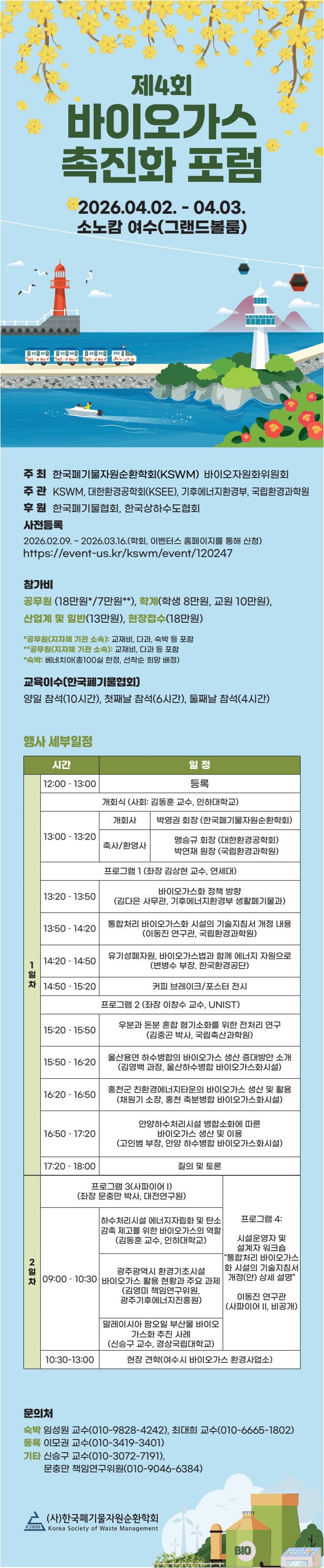 국내 [한국폐기물자원순환학회·대한환경공학회] 제4회 바이오가스 촉진화 포럼 개최 안내 일자 : 04.02 (목) ~ 04.03 (금) 장소 : 소노캄 여수(그랜드볼룸) Homepage : https://event-us.kr/kswm/event/120247 첨부파일 바이오가스 웹포스터 최종 0204 .pdf (다운 11회) 목록