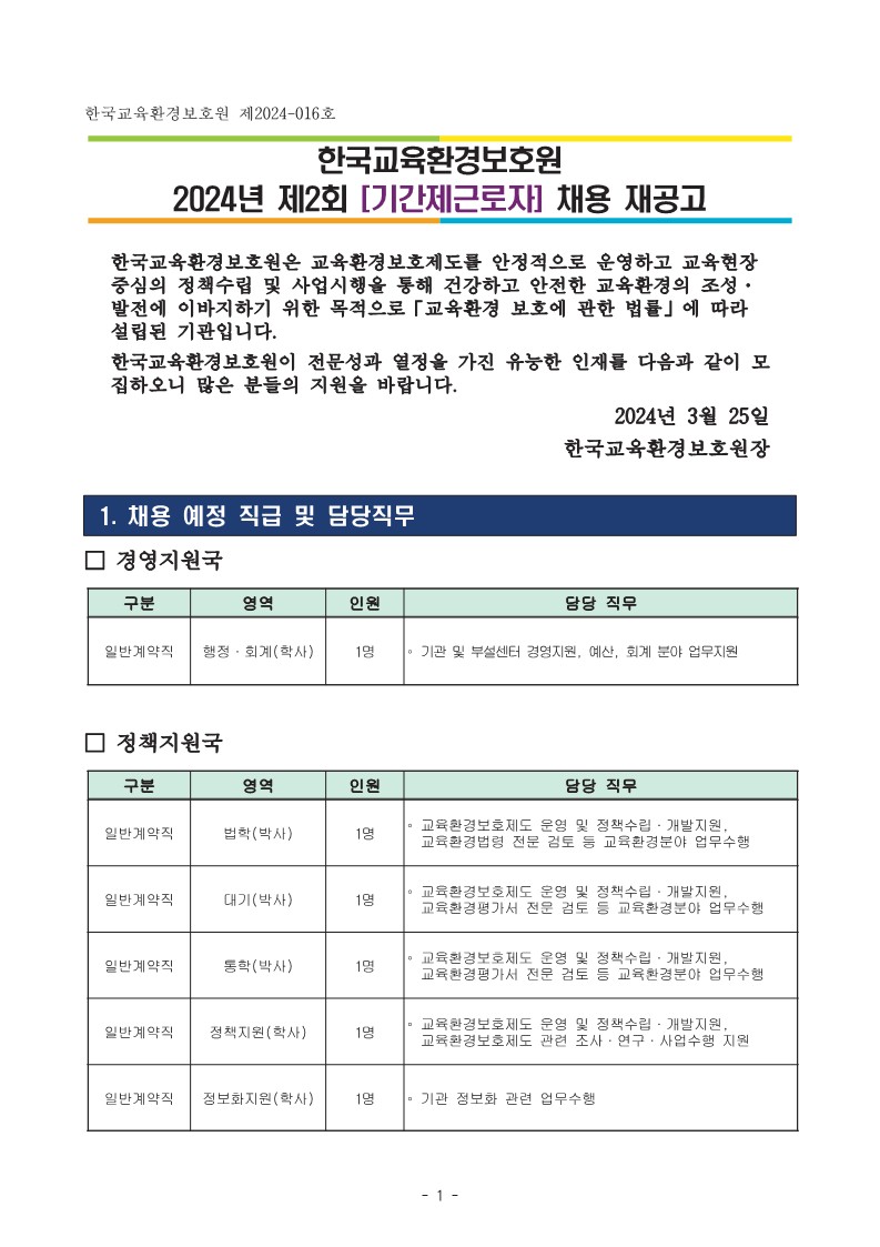 [한국교육환경보호원] 2024년 제2회 기간제근로자 채용 재공고 작성자 : 대한환경공학회 작성일 : 2024-03-28 조회수 : 360 (2024. 3. 25.) 2024년 제2회 기간제 채용 재공고문 등.hwp (다운로드 : 129회) 목록