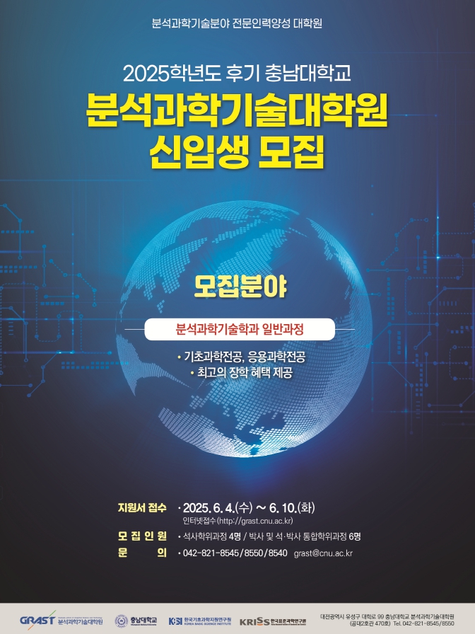 [분석과학기술대학원] 2025학년도 후기 신입생 모집 안내 작성자 : 대한환경공학회 작성일 : 2025-05-16 조회수 : 365 http://grast.cnu.ac.kr 붙임2 포스터 2025후기 .jpg (다운로드 : 305회) 붙임1 2025학년도 후기 신입생 모집요강.pdf (다운로드 : 292회) 붙임1 2025학년도 후기 신입생 모집요강.hwp (다운로드 : 270회) 목록