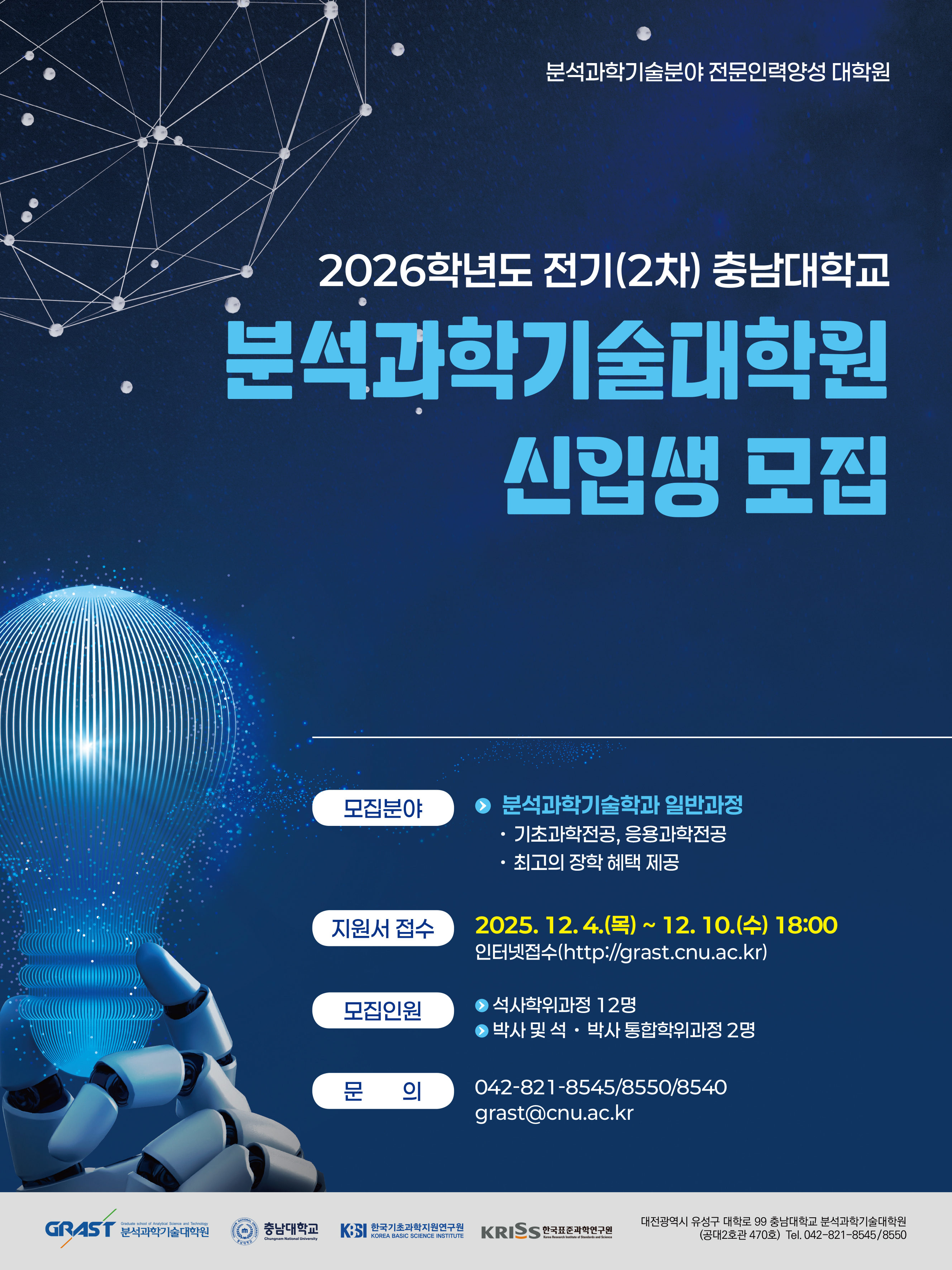 [충남대학교] 분석과학기술대학원 2026학년도 전기(2차) 신입생 모집 안내 작성자 : 대한환경공학회 작성일 : 2025-11-26 조회수 : 124 붙임1 2026학년도 전기 2차 분석과학기술대학원 모집요강.pdf (다운로드 : 87회) 붙임1 2026학년도 전기 2차 분석과학기술대학원 모집요강.hwp (다운로드 : 82회) 붙임2 포스터 2026전기2차 .jpg (다운로드 : 99회) 목록