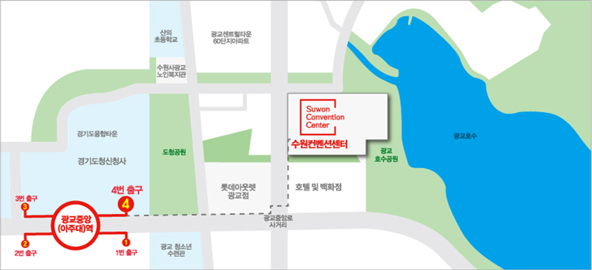 | 광역버스 하차 「광교중앙·아주대환승센터」 | 광교중앙역 하차 → (4번 출구, 도보 10분) → 수원컨벤션센터 도착 |