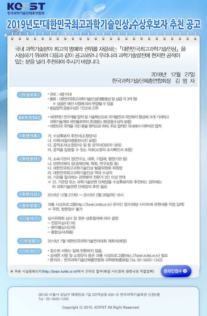 [한국과총] 대한민국최고과학기술인상 수상후보자 추천 공고 작성자 : 대한환경공학회 작성일 : 2019-01-22 조회수 : 1,692 2019년도 '대한민국최고과학기술인상" 후보자를 추천받고있습니다. 많은 참여 부탁드립니다. 과총 시상 홈페이지: http://brain.kofst.or.kr 대한민국최고과학기술인상 개요.hwp (다운로드 : 88회) 2019년도 대한민국최고과학기술인상 수상후보자 추천공고.jpg (다운로드 : 100회) 목록