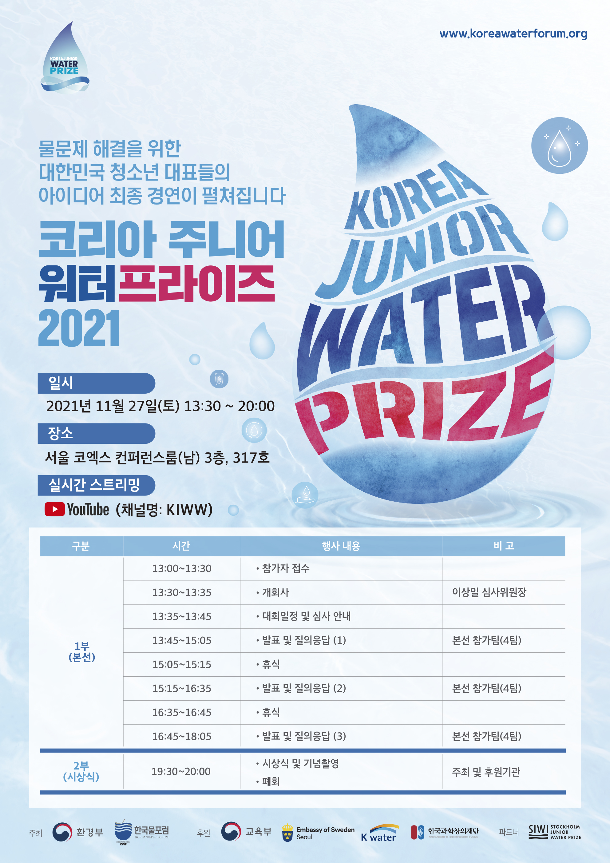 [한국물포럼] '코리아 주니어 워터프라이즈2021 본선 및 시상식' 개최 작성자 : 대한환경공학회 작성일 : 2021-11-24 조회수 : 609 행사명: 코리아 주니어 워터프라이즈2021 본선 및 시상식주 최: 환경부, 한국물포럼후 원: 교육부, 주한 스웨덴 대사관, K-water, 한국과학창의재단 일 시: 2021. 11. 27(토) 13:30~20:00장 소: 서울 코엑스 컨퍼런스룸(남) 3층참석자: 본선참가팀, 심사위원, 주최 및 후원기관 관계자 등 *코로나-19 확산예방을 위해 현장참관 불가, 유튜브 생중계 예정(채널명: KIWW)본 행사와 관련된 문의는 한국물포럼 사무국(전화:02-736-2921)으로 연락주시기 바랍니다. 붙임1_코리아 주니어워터프라이즈2021 본선 및 시상식 개최계획.pdf (다운로드 : 81회) 붙임2_코리아 주니어 워터프라이즈2021 포스터.jpg (다운로드 : 94회) 목록
