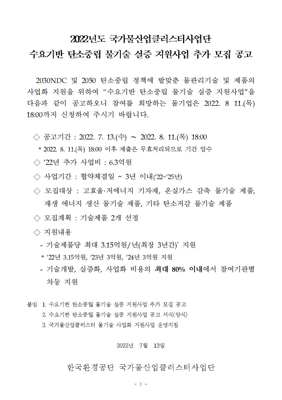 [국가물산업클러스터사업단] 탄소중립 지원사업 추가 모집 공고 홈페이지 게재 협조 요청 작성자 : 대한환경공학회 작성일 : 2022-07-20 조회수 : 373 (붙임) 공고문 및 서식.zip (다운로드 : 81회) 목록