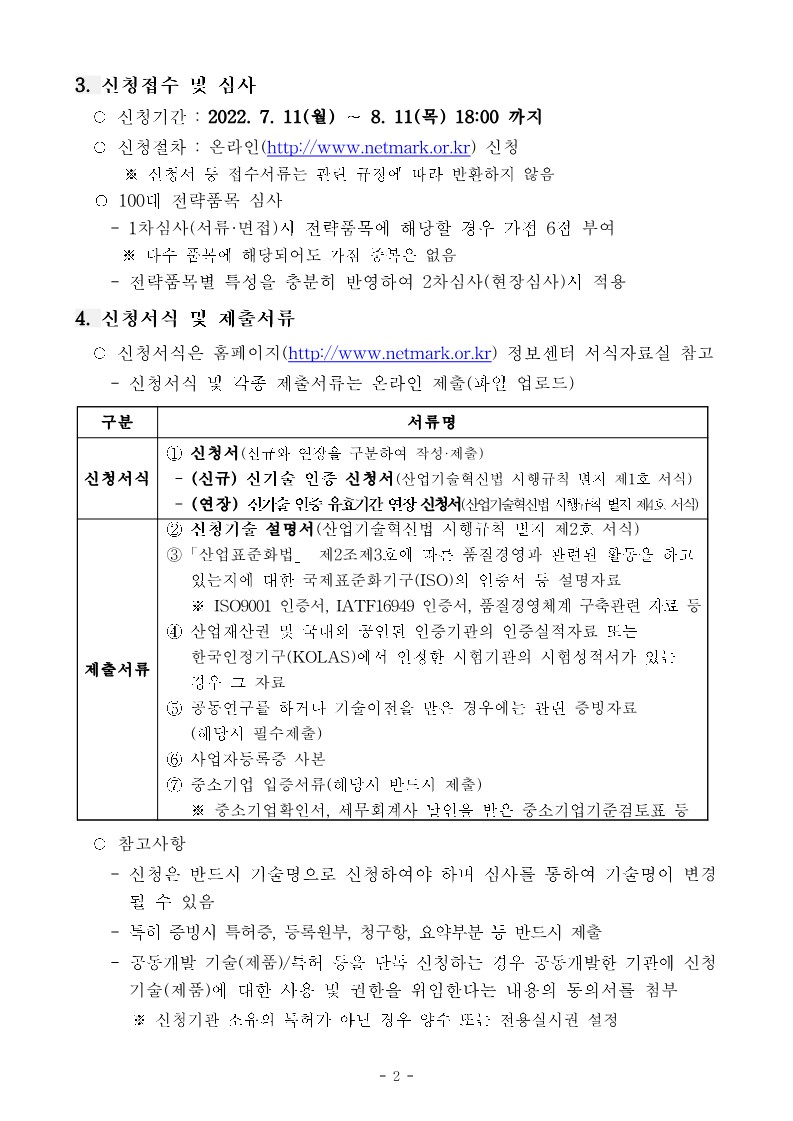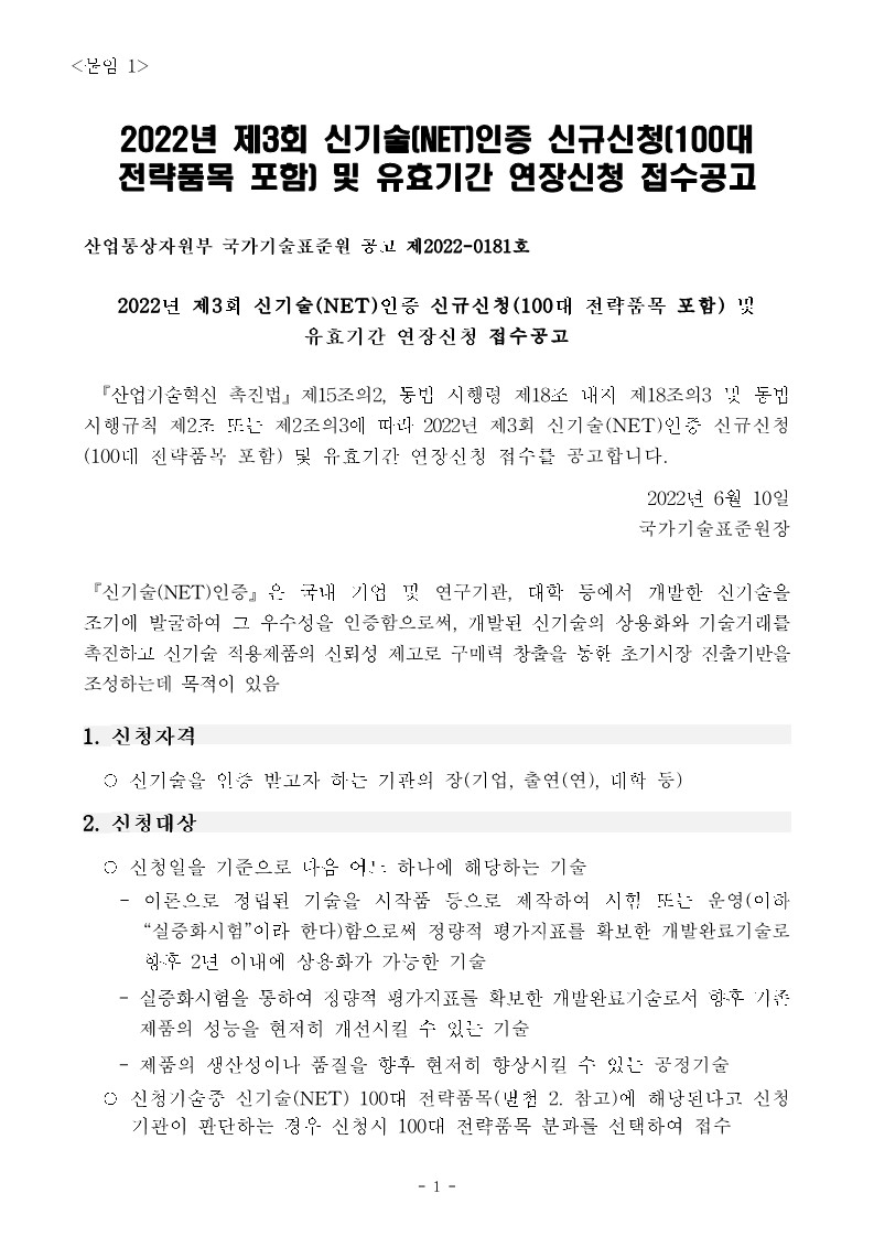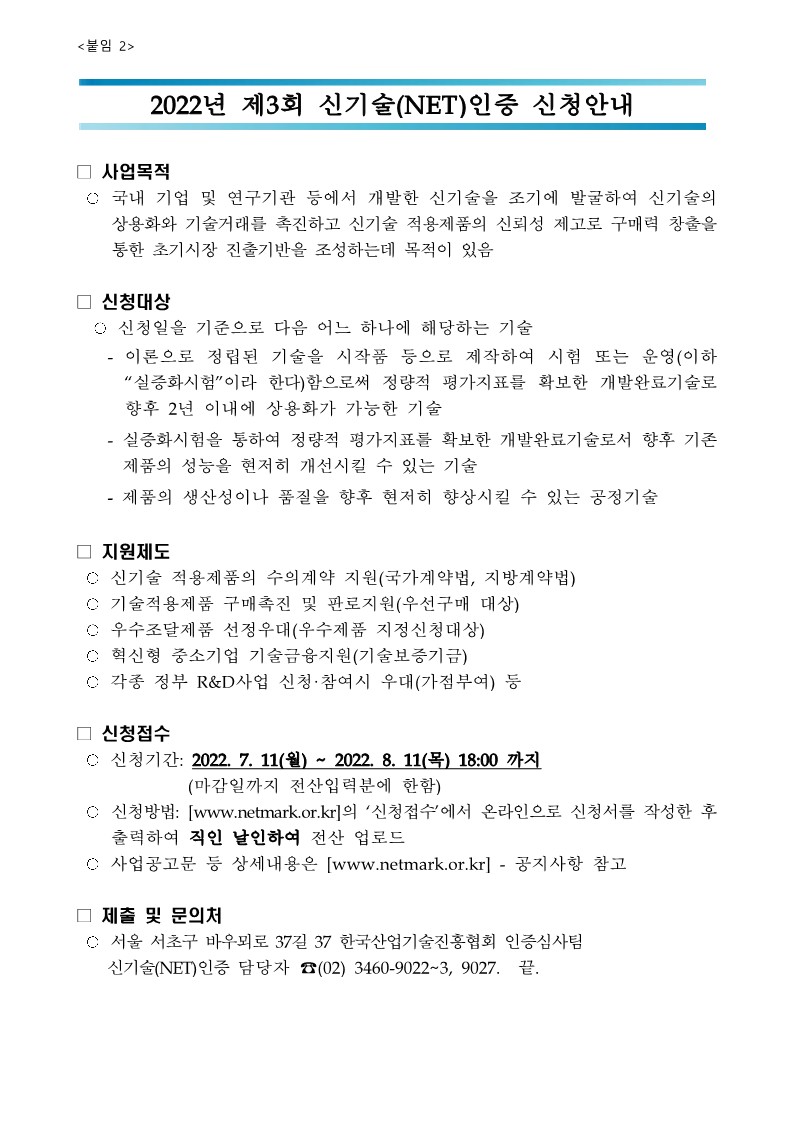 [한국산업기술진흥협회] 2022년 제3회 산업통상자원부 신기술(NET)인증 신청안내 공지 협조요청 작성자 : 대한환경공학회 작성일 : 2022-07-22 조회수 : 302 http://www.netmark.or.kr/ 목록