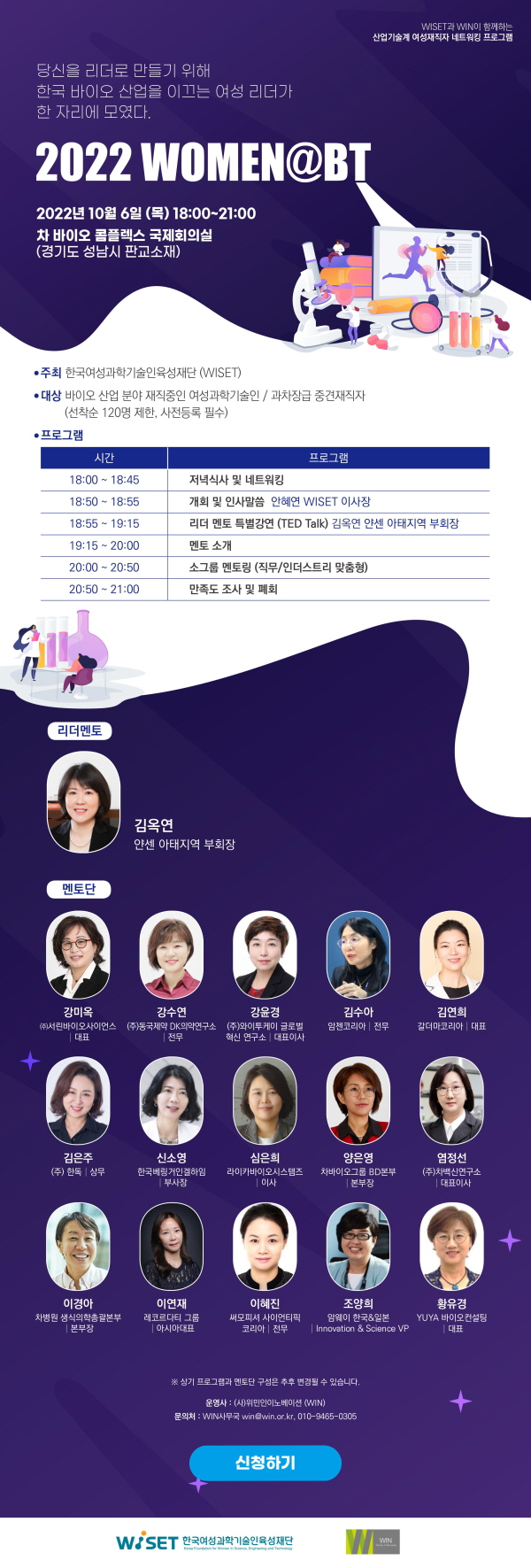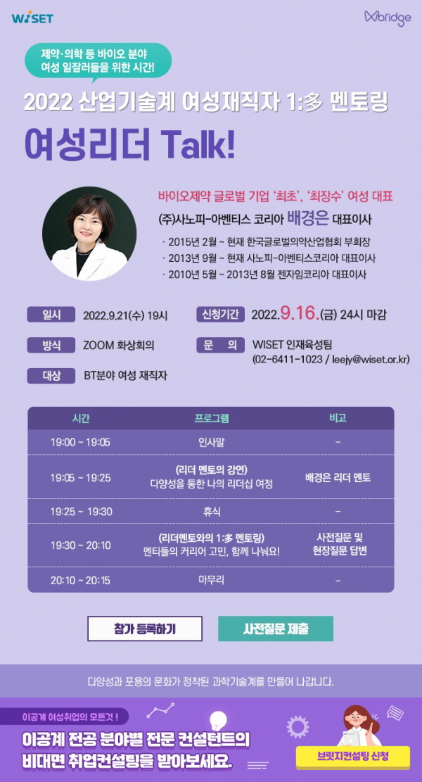[WISET] 바이오 분야 여성 재직자 대상 리더 역량 강화 프로그램(9/10월) 홍보 협조 요청 작성자 : 대한환경공학회 작성일 : 2022-09-08 조회수 : 351 https://bit.ly/3KWaL2j (이메일, 홈페이지 게시용) 2022 WOMEN@BT HTML.HTML (이메일, 홈페이지 게시용) 여성리더TALK 포스터 HTML_공문 발송용.HTML 목록