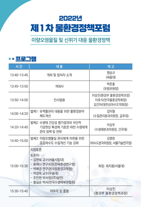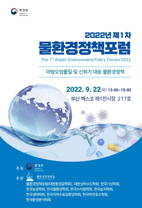 [환경부] 2022년 제1차 물환경정책포럼 개최 안내 작성자 : 대한환경공학회 작성일 : 2022-09-21 조회수 : 582 1. 행사명: 2022년 제1차 물환경정책포럼 2. 일시: 2022년 9월 22일(목) 13:40~15:40 3. 장소: 부산 벡스코 제1전시장 217호 4. 주최: 환경부 5. 주관: 물환경정책포럼(대한환경공학회), 대한상하수도학회, 한국기상학회, 한국농공학회, 한국물환경학회, 한국수자원학회, 한국습지학회, 한국생태학회, 한국지하수토양환경학회, 한국하천호수학회, 한국환경분석학회 22물환경정책포럼1차포럼 초청장.pdf (다운로드 : 193회) 목록