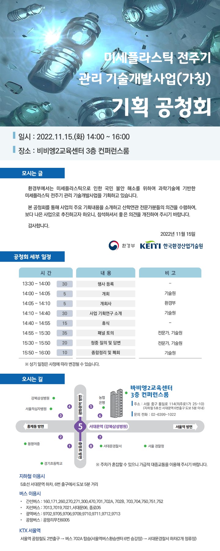 [한국환경산업기술원] 미세플라스틱 전주기 관리 기술개발사업(가칭) 기획 공청회 안내(22.11.15.(화), 서울 바비엥2교육센터) 작성자 : 대한환경공학회 작성일 : 2022-11-03 조회수 : 291 (붙임)초청장.pdf (다운로드 : 87회) 목록