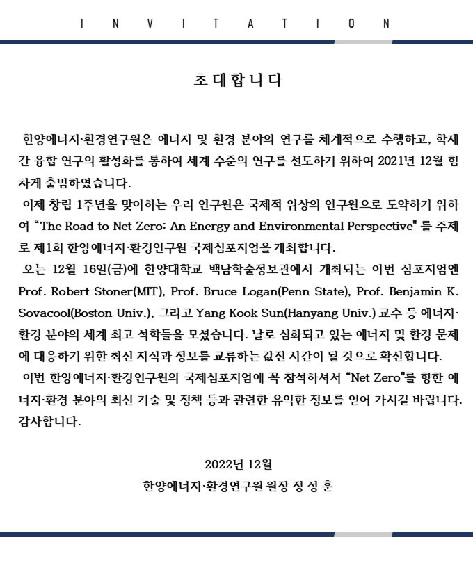 [한양대학교] 한양에너지환경연구원 국제심포지엄 홈페이지 홍보 작성자 : 대한환경공학회 작성일 : 2022-12-05 조회수 : 354 문의처: 서진선(02-2220-2498 / jinsun52021@hanyang.ac.kr) 목록