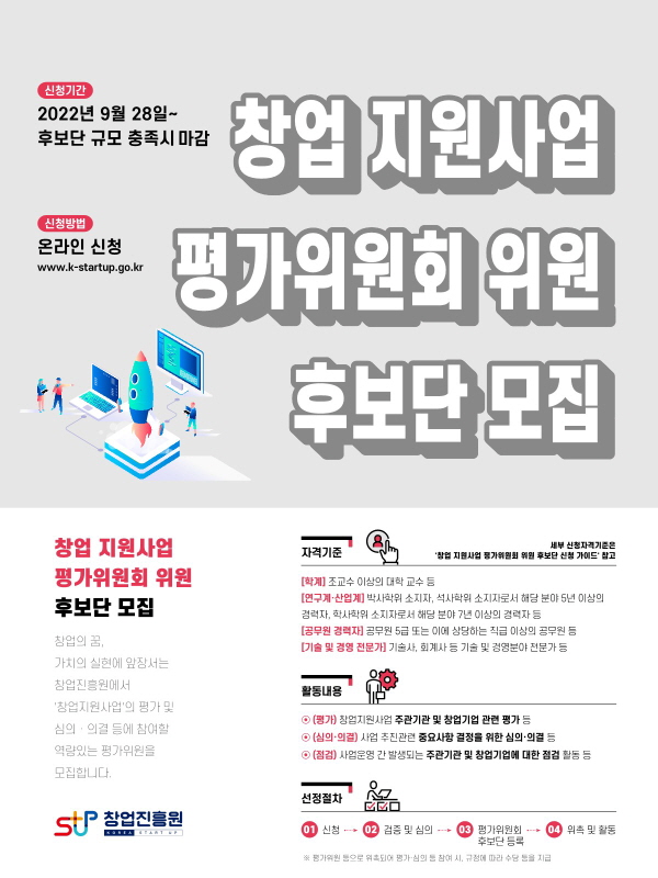 [창업진흥원/창업성장총괄실] 창업 지원사업 평가위원회 위원 후보단 모집 안내 및 홍보협조 요청 작성자 : 대한환경공학회 작성일 : 2022-12-12 조회수 : 283 자세한 사항은 첨부파일을 참고하여 주시기 바랍니다. (붙임1) 평가위원 모집 안내문.pdf (다운로드 : 88회) (붙임2) 평가위원 신청 가이드.pdf (다운로드 : 91회) (붙임3) 평가위원 모집 포스터.pdf (다운로드 : 91회) 목록