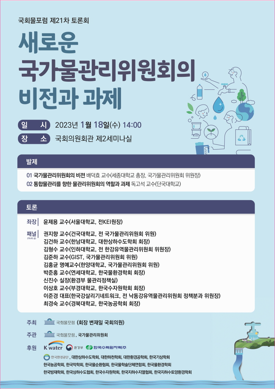 [국회물포럼] "새로운 국가물관리위원회의 비전과 과제" 토론회 홍보 요청 작성자 : 대한환경공학회 작성일 : 2023-01-05 조회수 : 263 붙임1. 제21차 국회물포럼 토론회 계획안.pdf (다운로드 : 122회) 목록