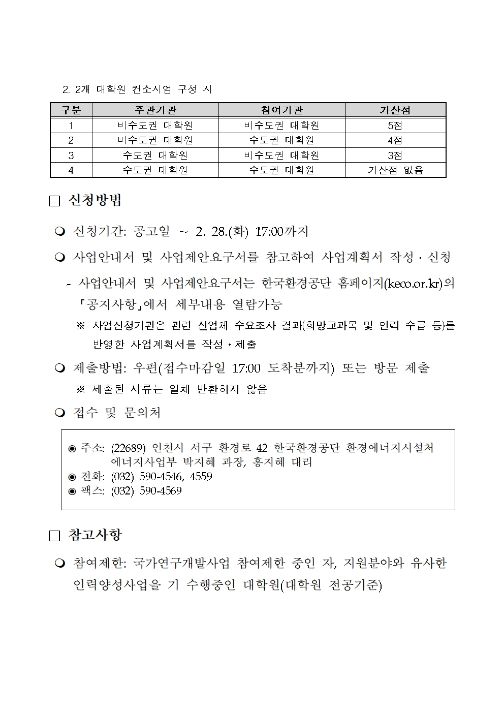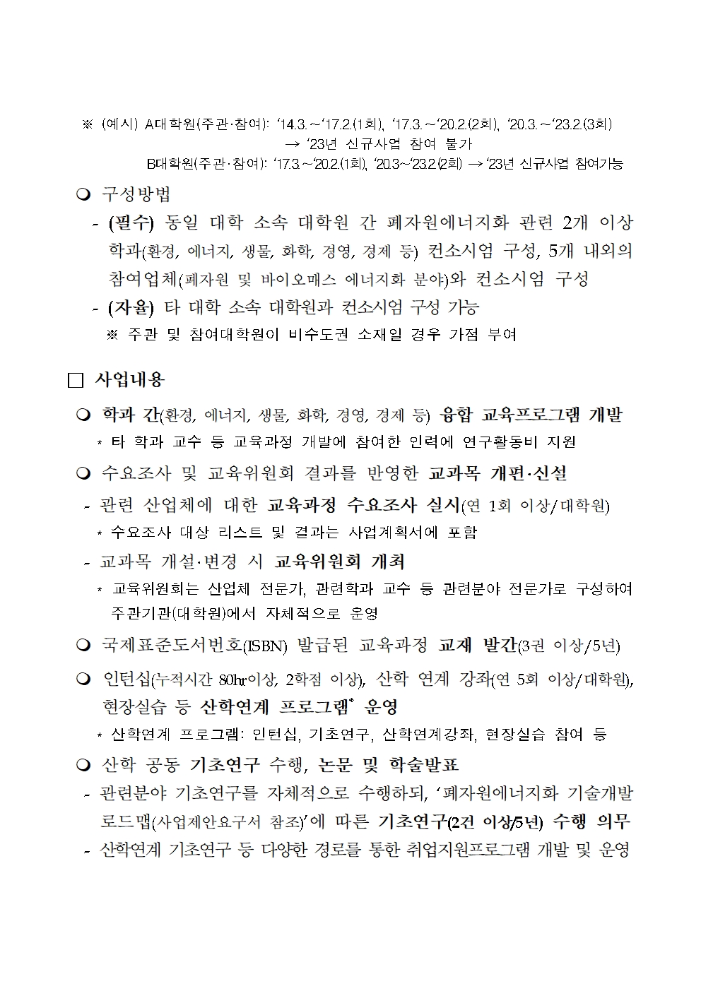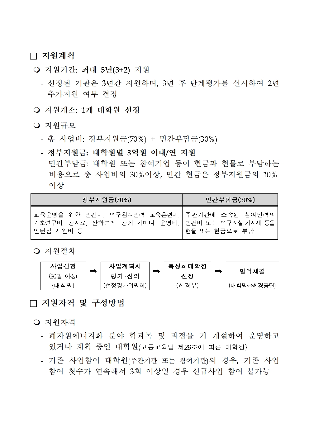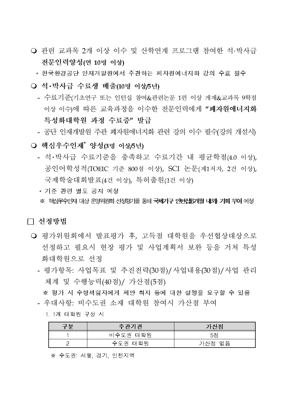[한국환경공단 에너지사업부] 폐자원에너지화 특성화대학원 사업 공고 안내 작성자 : 대한환경공학회 작성일 : 2023-02-09 조회수 : 241 [붙임]+2023년+폐자원에너지화+특성화대학원+공고+및+사업안내서.hwp (다운로드 : 75회) 목록