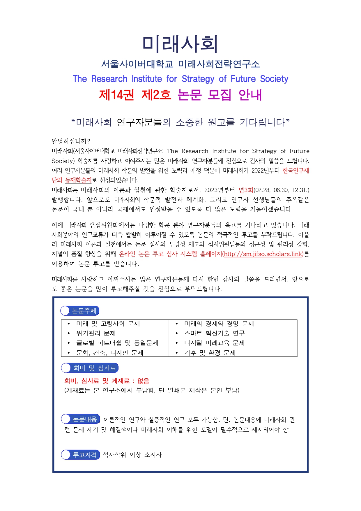 [서울사이버대학교 미래사회전략연구소] <미래사회> 제14권 2호 논문투고 안내 작성자 : 대한환경공학회 작성일 : 2023-04-03 조회수 : 380 투고양식 (1).zip (다운로드 : 106회) 학술지 미래사회_연구윤리 규정(2021.08.26 (1).pdf (다운로드 : 110회) 목록